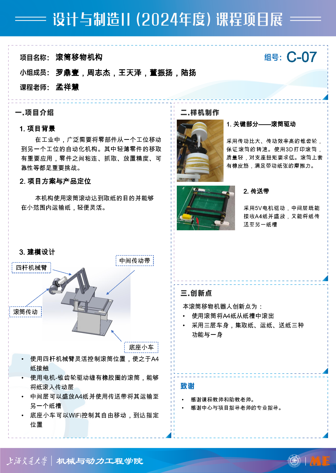 本项目围绕滚筒移物机构展开,旨在设计并构建一个能自动抓取并转移轻薄零件(以 A4 纸为例)的装置,以应对工业生产中轻薄零件移取的需求及相关挑战,如零件粘连、抓取和放置精度及可靠性等问题。项目团队综合运用机械设计、电子控制等多领域知识,设计出包含四杆机械臂、滚筒传动、底座移动小车及中间传动装置的系统,并通过精心挑选材料、优化传动方案及控制方式等手段实现机构功能。