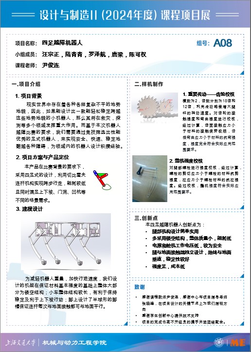 现实世界中存在着各种各样复杂不平的地势地貌,因此,如果能设计出一款能轻松稳定跨越这些地势地貌的小机器人,那么其将在救灾,探测等多个领域发挥重大作用。而基于本次机器人越障比赛的要求,我们需要通过竞技筛选出性能优秀的足式机器人,来实现安全、快速、稳定地翻越各种障碍,为领域内的机器人设计积攒经验。