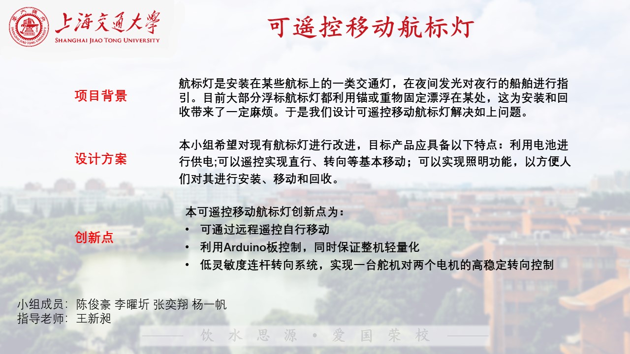 本小组希望对现有航标灯进行改进,目标产品应具备以下特点:利用电池进行供电;可以遥控实现直行、转向等基本移动;可以实现照明功能,以方便人们对其进行安装、移动和回收。