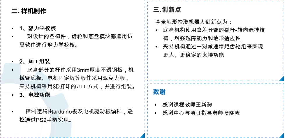 设计并开发一款多地形拾取机器人,能够实现在多种复杂地形上的稳定移动与物品拾取能力,并完成了样机的制作。
