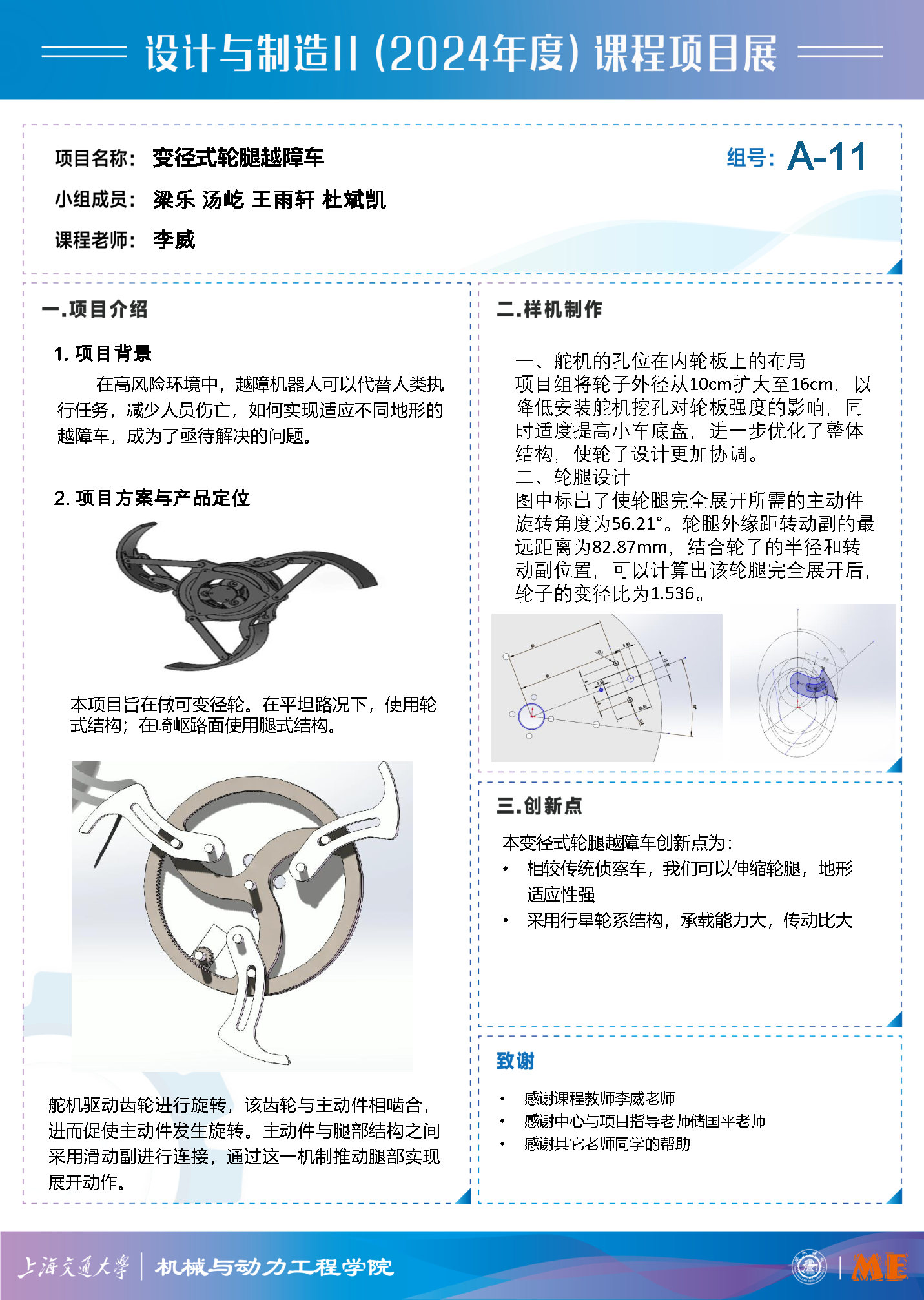本变径式轮腿越障车创新点为:• 相较传统侦察车,我们可以伸缩轮腿,地形适应性强• 采用行星轮系结构,承载能力大,传动比大