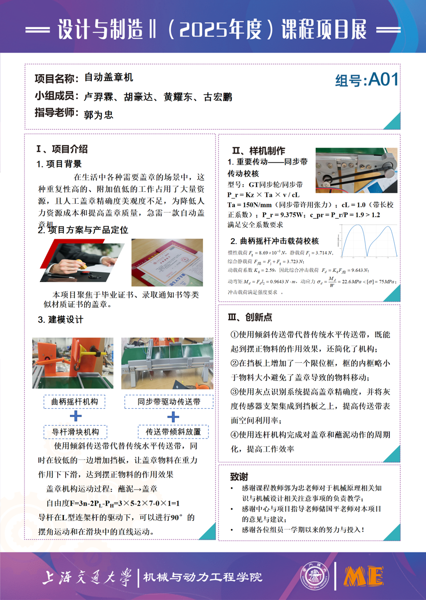 本项目是聚焦于毕业证书、录取通知书等类似材质证书的盖章,集连杆机构、倾斜传动带机构和灰度传感识别模式于一体的自动盖章机。