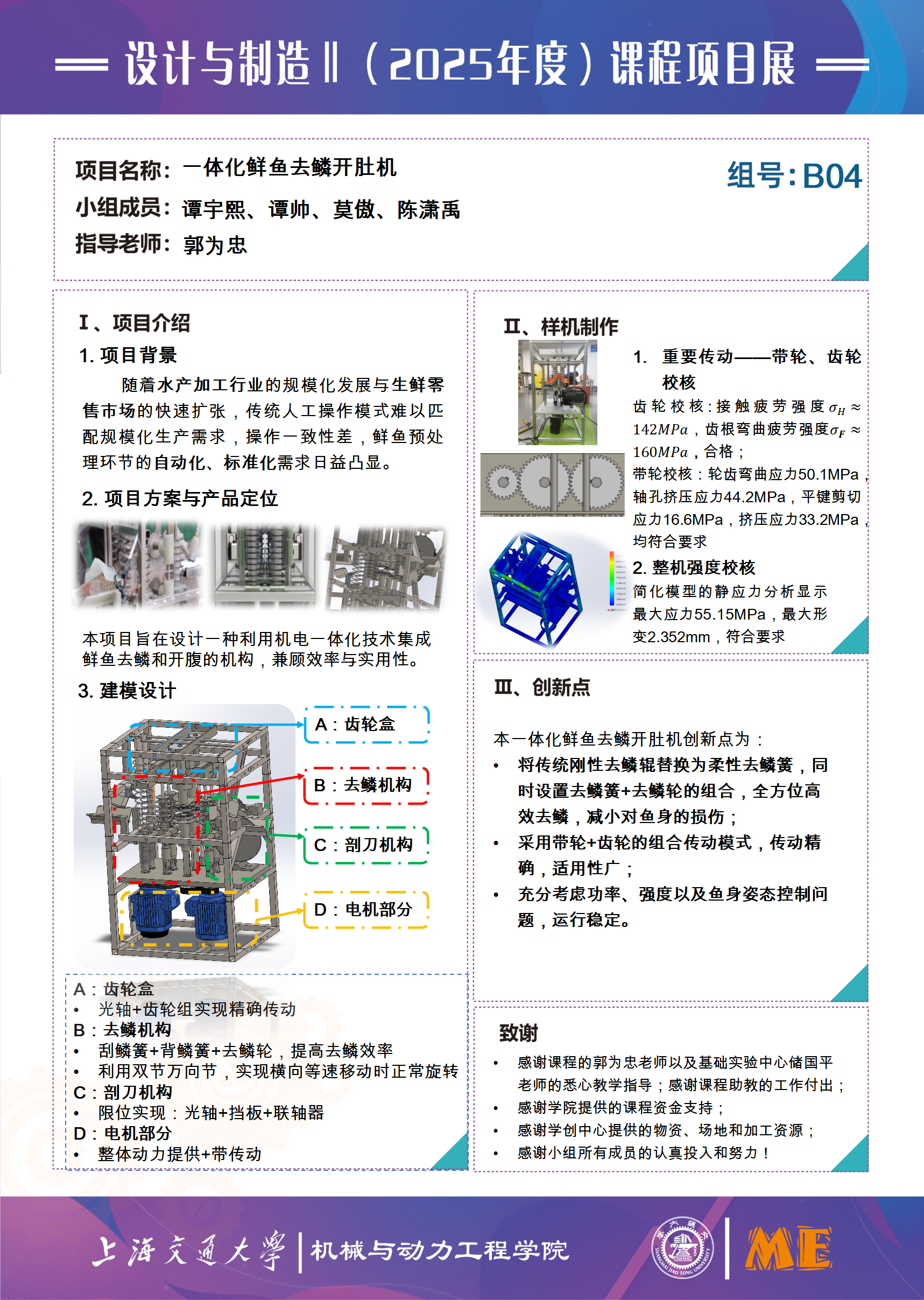 本项目旨在设计并制造一款一体化鲜鱼去鳞开肚机。采用去鳞簧、传送齿、去鳞轮、圆锯的顺序输送方式,通过带传动实现动力传递,并在一定范围内适应不同的鱼身大小