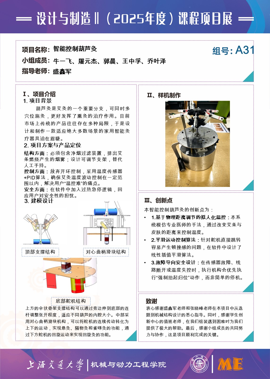 上方的伞状骨架支撑结构可以通过旁边伸到底部的连杆调整张开程度,适应不同葫芦的内腔大小。中部采用对心曲柄滑块机构,可以将舵机的连续传动转化为上下的运动,实现悬灸、隔物灸和雀啄灸的功能,通过下方舵机的回旋运动来实现回旋灸的功能。