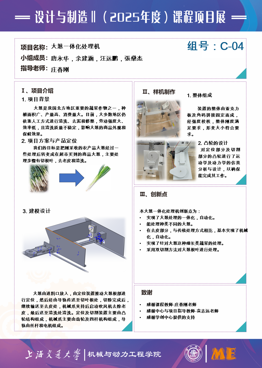 1. 完成了整体机械的组装拼接,实现了各个模块的既定功能,大葱的处理效果较好。