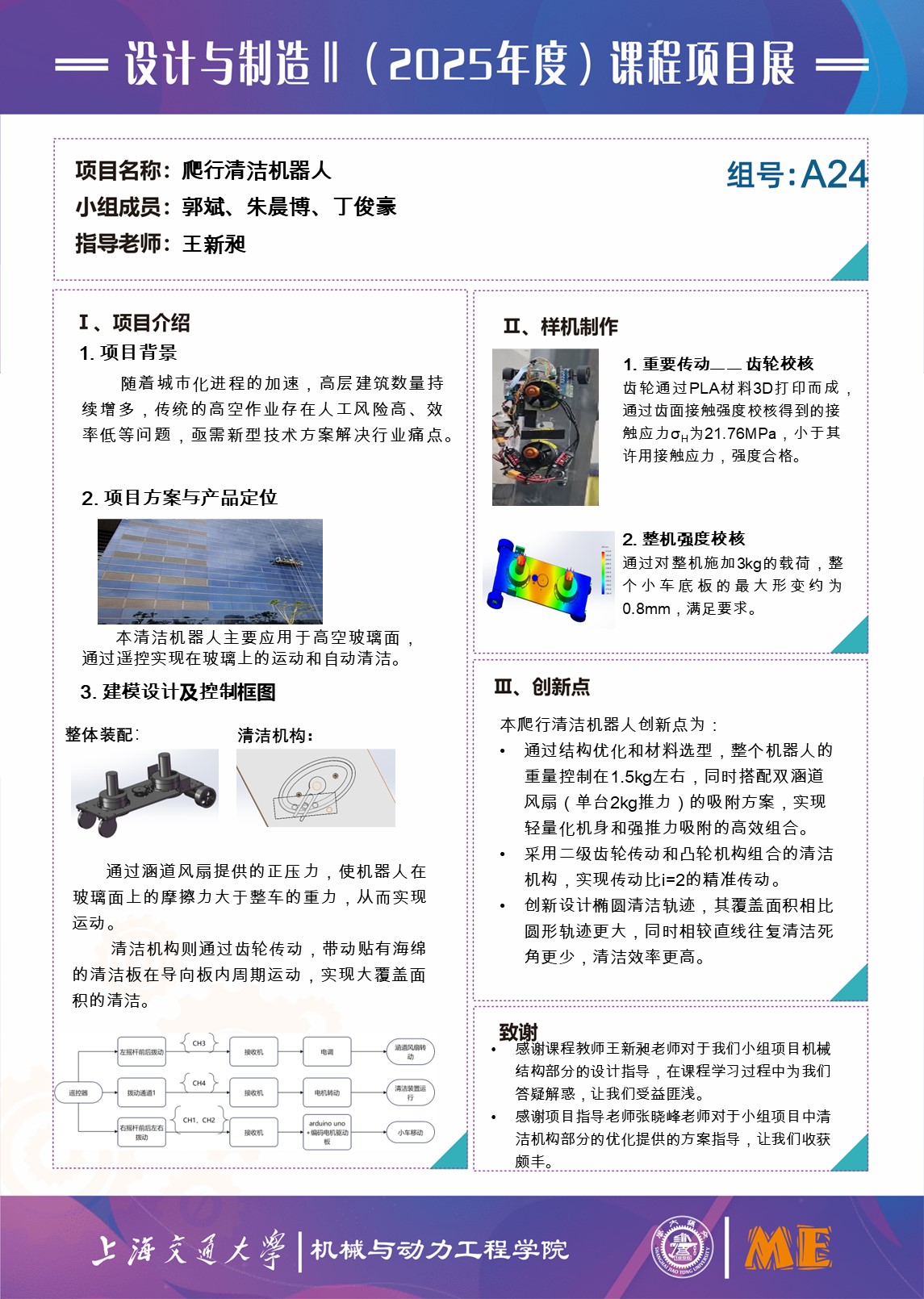 设计一款适用于高层建筑玻璃面的爬行机器人,能够实现稳定吸附、高效清洁、安全可靠的核心功能,达到代替部分人工清洁作业的效果。