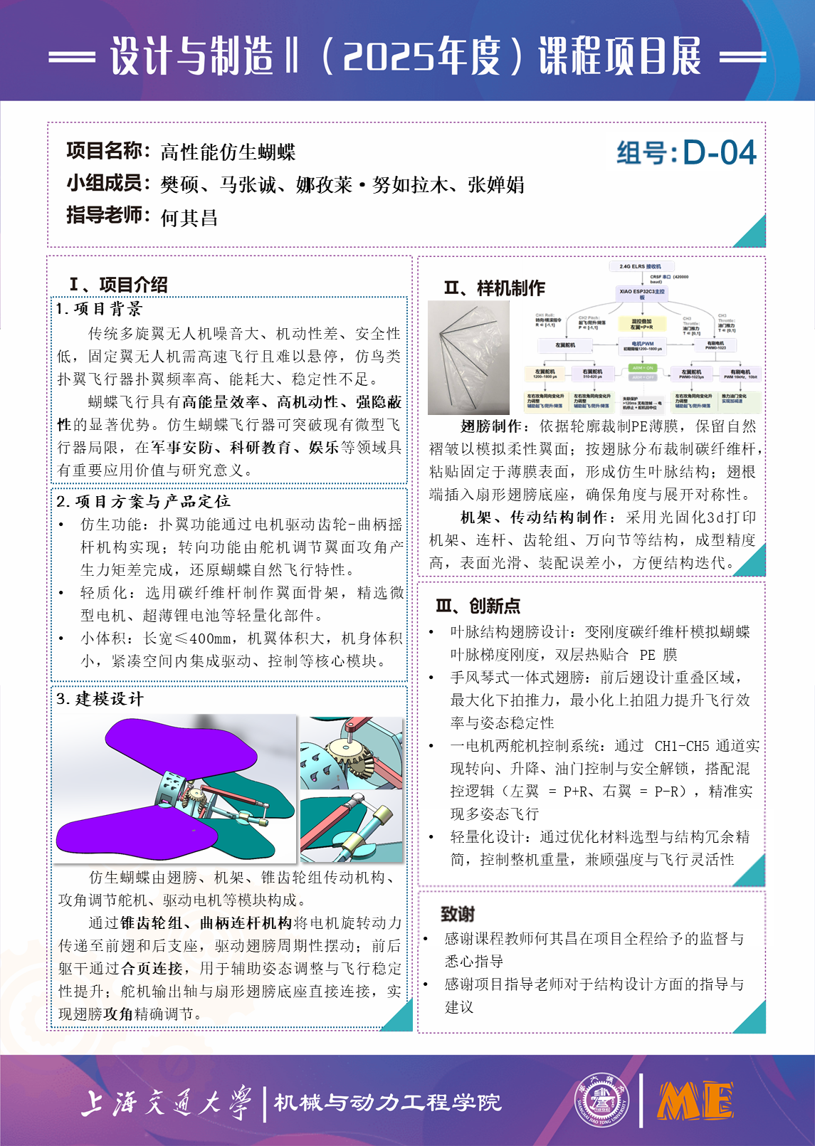 本项目由beat365中文官方网站2023级本科生张婵娟、樊硕、马张诚、娜孜莱·努如拉木组成团队,何其昌担任指导教师。项目立足蝴蝶独特飞行原理,聚焦仿生飞行器的创新设计与制造,通过调研市场实用需求及相关数据,明确研发方向与意义。设计上采用柔性气动特点翅型,以碳纤维杆、PE 薄膜为核心材料,打造叶脉结构,结合一电机两舵机的动力结构,通过通道归一化、翼面混控等技术,实现起飞、巡航、转向、降落等动作,同时融入减重设计与失联保护、ARM 解锁急停等安全机制,兼顾飞行效率、稳定性与安全性,具备广泛应用潜力。