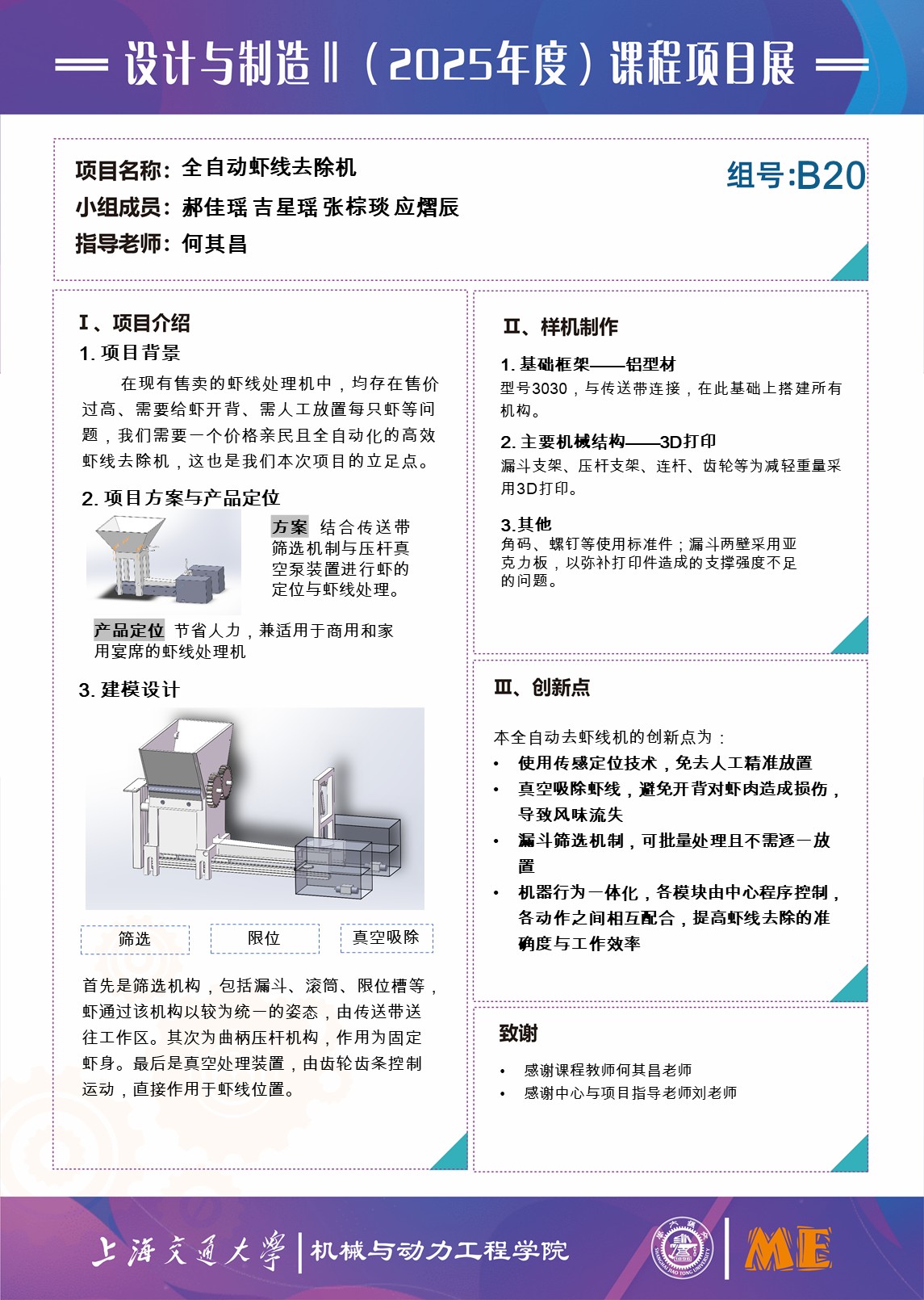 本项目针对人工去虾线效率低下、现有自动化设备价格昂贵且普遍损伤虾体的行业痛点,研发一套低成本、非开背的自动化去虾线系统。方案采用超声波测距进行虾体定位,结合运动控制与真空抽吸技术,实现虾线的完整抽除。该系统最大程度保持了虾体外形完整,显著提高处理效率,适用于家庭厨房、中小型餐饮及水产加工场景。