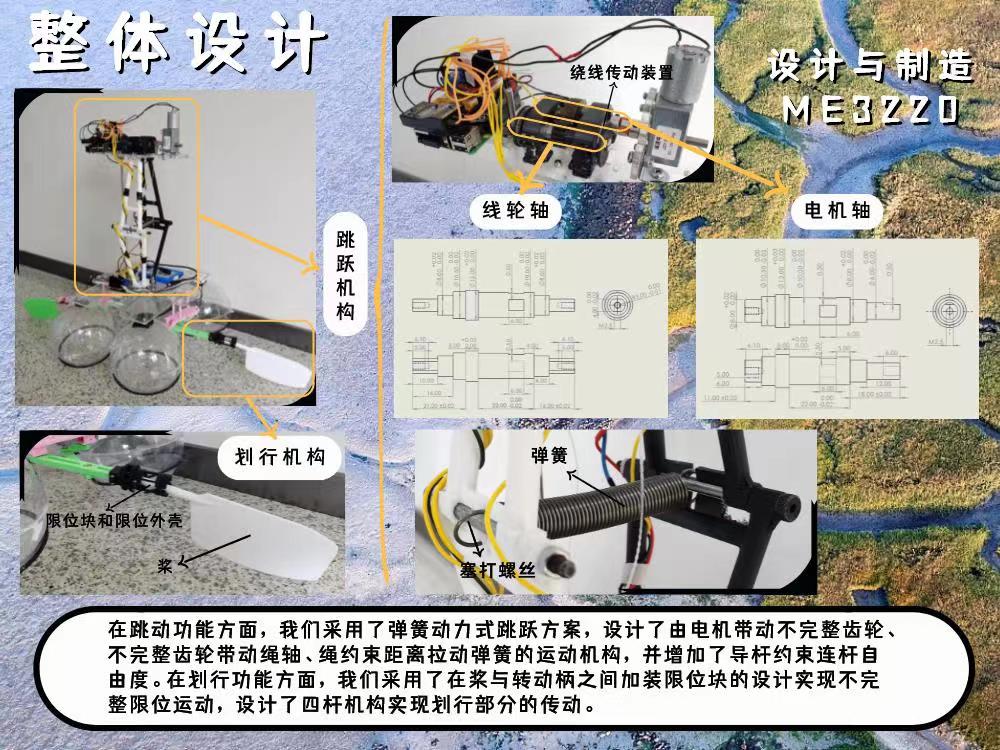 在跳动功能方面,我们采用弹簧动力式方案,设计了由电机带动不完整齿轮、不完整齿轮带动线轴、绳约束距离拉动弹簧的运动机构,当不完整齿轮与完整齿轮啮合时,弹簧拉伸储能,当不完整齿轮不与完整齿轮啮合时,弹簧收缩释放能量,机器人跳起,基本实现了跳跃功能。我们增加导杆约束连杆自由度以约束跳跃后的运动方向。在滑行功能方面,我们采用在桨与转动柄之间加装限位块的设计实现不完整限位运动,设计了四杆机构实现滑行部分传动,实现了滑动前行及差速滑行转向。电控部分集成传感器在控制运动的同时控制数据采集,实现监测的目的。