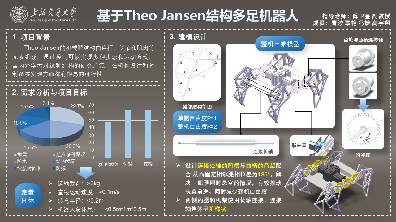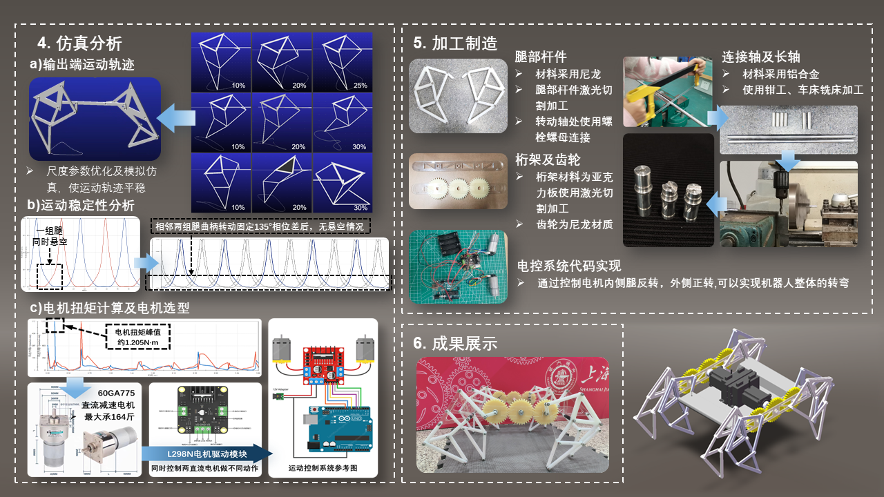 我们通过改进结构设计,使用CAD技术进行模拟和优化,提高Theo Jansen结构的运动稳定性和效率;利用更轻量、强度更高的材料,减轻结构负荷并增加寿命;同时,动力系统优化:对结构的动力传递系统进行改进,从而降低能源消耗并提高运动控制的精度。