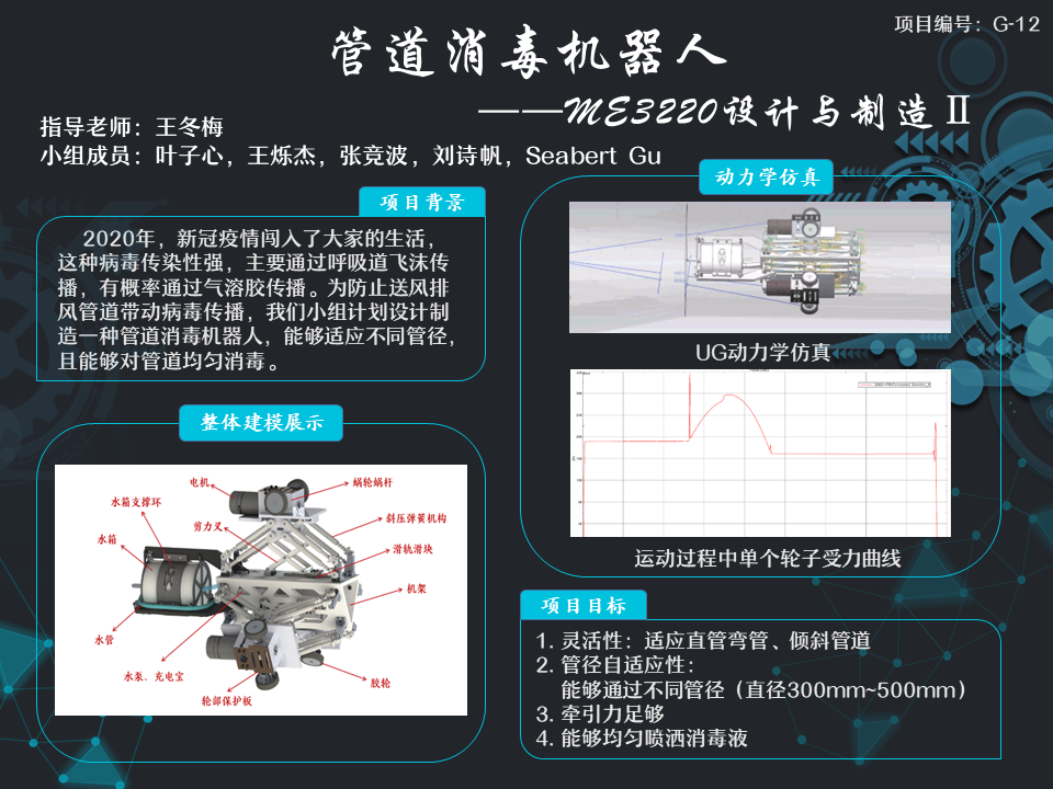 管道,遍布在我们生活的四处,从每家每户到商场大楼、图书馆,都能见到各种各样的管道。这些管道在日常生活中难以清洁,很容易变成清洁死角,尤其是垂直设立的长管道,拆卸清理都变得不易。时间未经清洁的管道不仅滋生细菌、产生异味,在新冠疫情的当下,还容易成为飞沫传输的途径。管道消毒机器人项目,意在设计出一种可以清理消毒管道的方案,即可以适应不同管径(本项目为直径30cm~50cm)、各种倾角的管道,且可在管道内部移动、喷洒清洁的机器人,使得平时难以清洁的卫生死角得以清理。