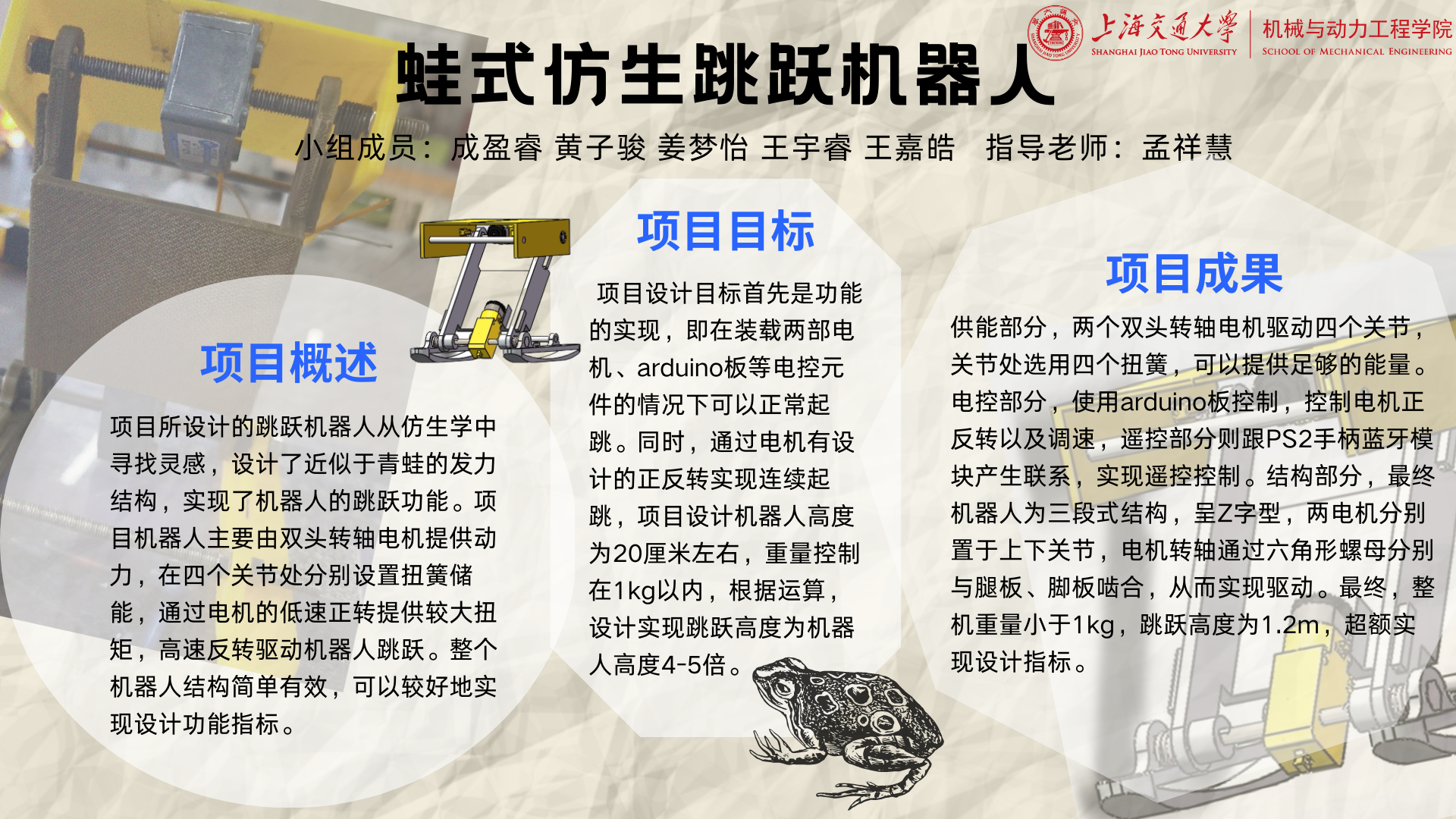 越障、避障是现代机器人技术中的重要内容,除传统的障碍识别并合理巡线的方法外,跳跃也是有效的避障方式。通过跳跃,机器人可以越过崎岖的地形,跨越高度高于机器人本身几倍的障碍。但由于机器人自身重量等因素,依赖于能量瞬间爆发的跳跃机器人设计起来颇有难度。项目所设计的跳跃机器人从仿生学中寻找灵感,设计了近似于青蛙的发力结构,实现了机器人的跳跃功能。项目机器人主要由双头转轴电机提供动力,在四个关节处分别设置扭簧储能,通过电机的低速正转提供较大扭矩,高速反转驱动机器人跳跃。整个机器人结构简单有效,可以较好地实现设计功能指标。