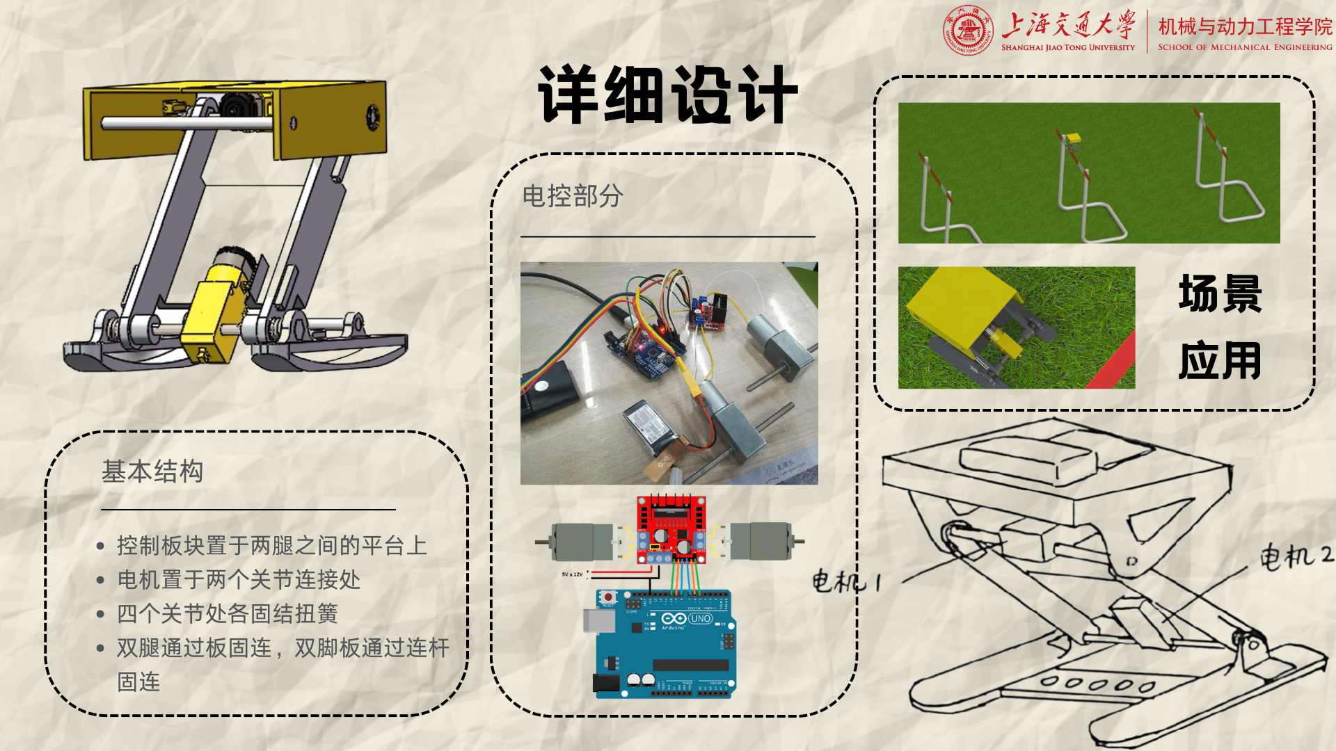 经过努力,项目基本达到预期要求。供能部分,最终选择9V航模电池供电,两个双头转轴电机驱动四个关节,电机扭矩大于5.7kg/cm。关节处选用四个扭簧,扭簧初始角度为90度,可以提供足够的能量。电控部分,使用arduino板控制,编写程序主要包括电机控制部分和遥控部分,电机控制部分即控制电机正反转以及调速,遥控部分则跟PS2手柄蓝牙模块产生联系,实现遥控控制。结构部分,最终机器人为三段式结构,呈Z字型,两电机分别置于上下关节,电机转轴通过六角形螺母分别与腿板、脚板啮合,从而实现驱动。最终,整机重量小于1kg,跳跃高度为1.2m,超额实现设计指标。