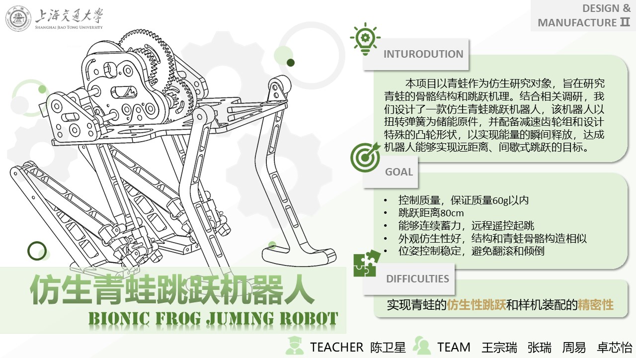 基于设计与制造Ⅱ课程项目所设置的项目挑战赛——仿生青蛙跳跃机器人,本项目以青蛙作为仿生研究对象,旨在研究青蛙的骨骼结构和跳跃机理。结合相关调研,我们设计了一款仿生青蛙跳跃机器人,该机器人根据青蛙骨骼结构,创造性地设计双平行四边形结构模拟青蛙后肢,以扭转弹簧为储能原件,配备减速齿轮组和设计特殊的凸轮形状,并通过红外遥控方式远程控制,以实现能量的连续储存和瞬间释放,达成机器人能够实现远距离、间歇式跳跃的目标。
