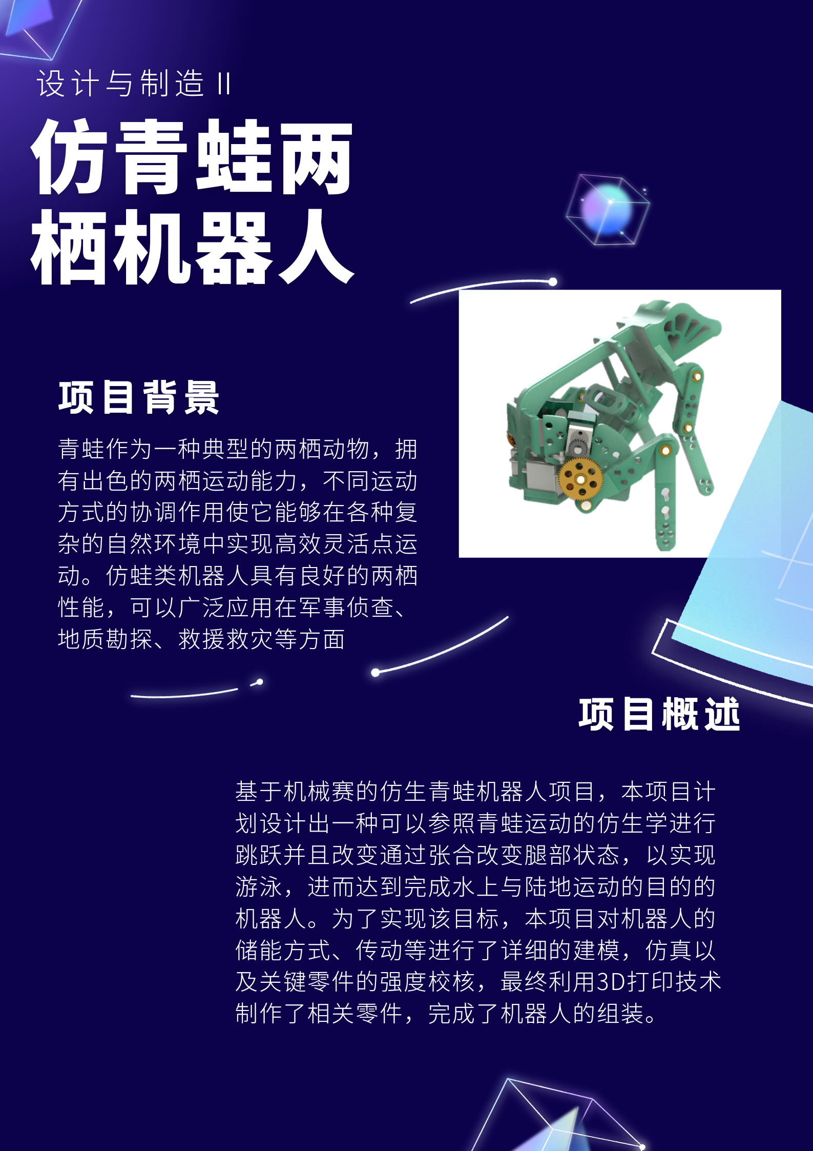 基于机械赛的仿生青蛙机器人项目,本项目计划设计出一种可以参照青蛙运动的仿生学进行跳跃并且改变通过张合改变腿部状态,以实现游泳,进而达到完成水上与陆地运动的目的的机器人。