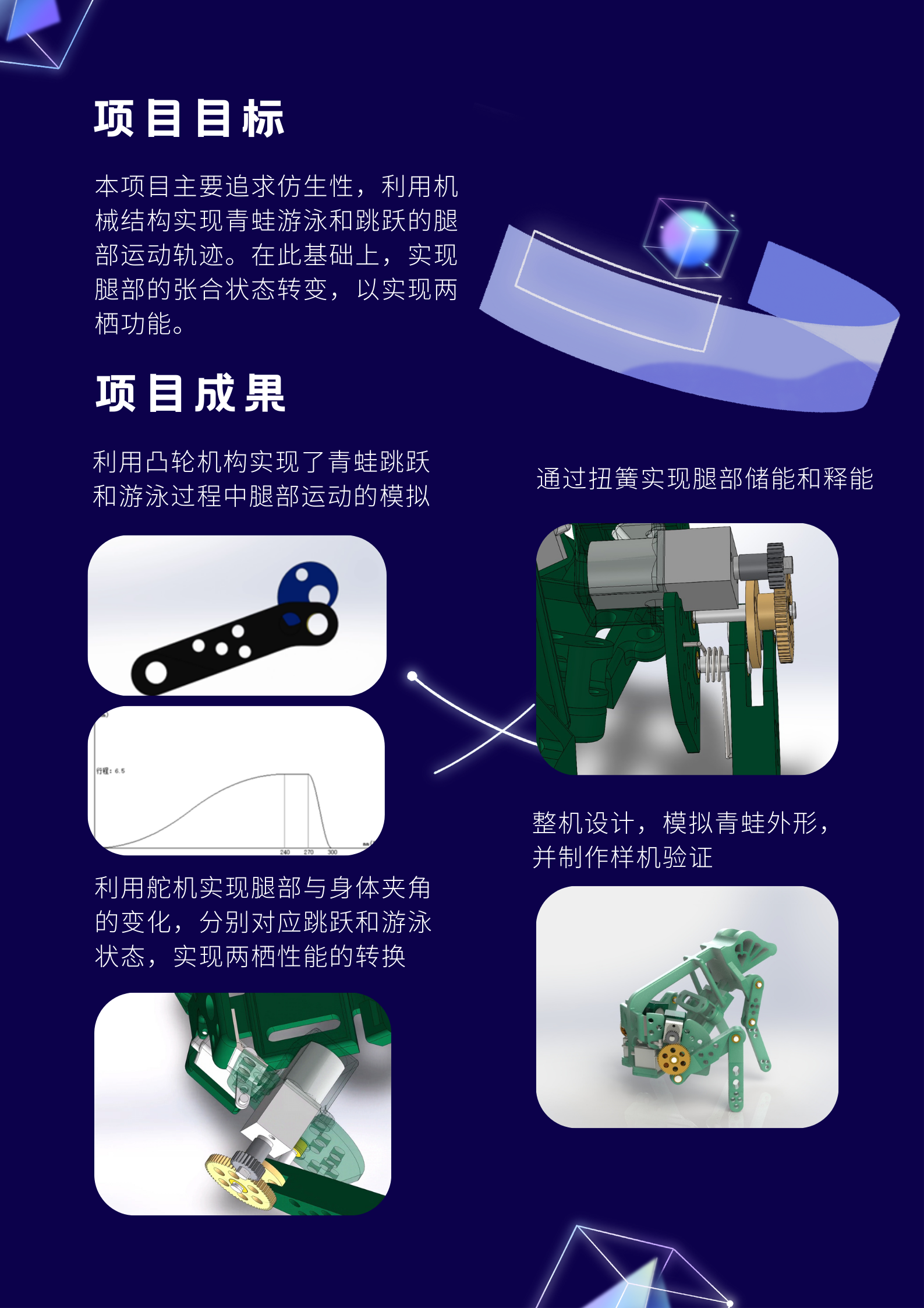 利用凸轮机构实现了青蛙跳跃和游泳过程中腿部运动的模拟,达到动作的连续性;通过扭簧实现了腿部的储能和释放;利用舵机实现了腿部与身体夹角的变化,分别对应跳跃与游泳状态,实现了两栖性能的转换。