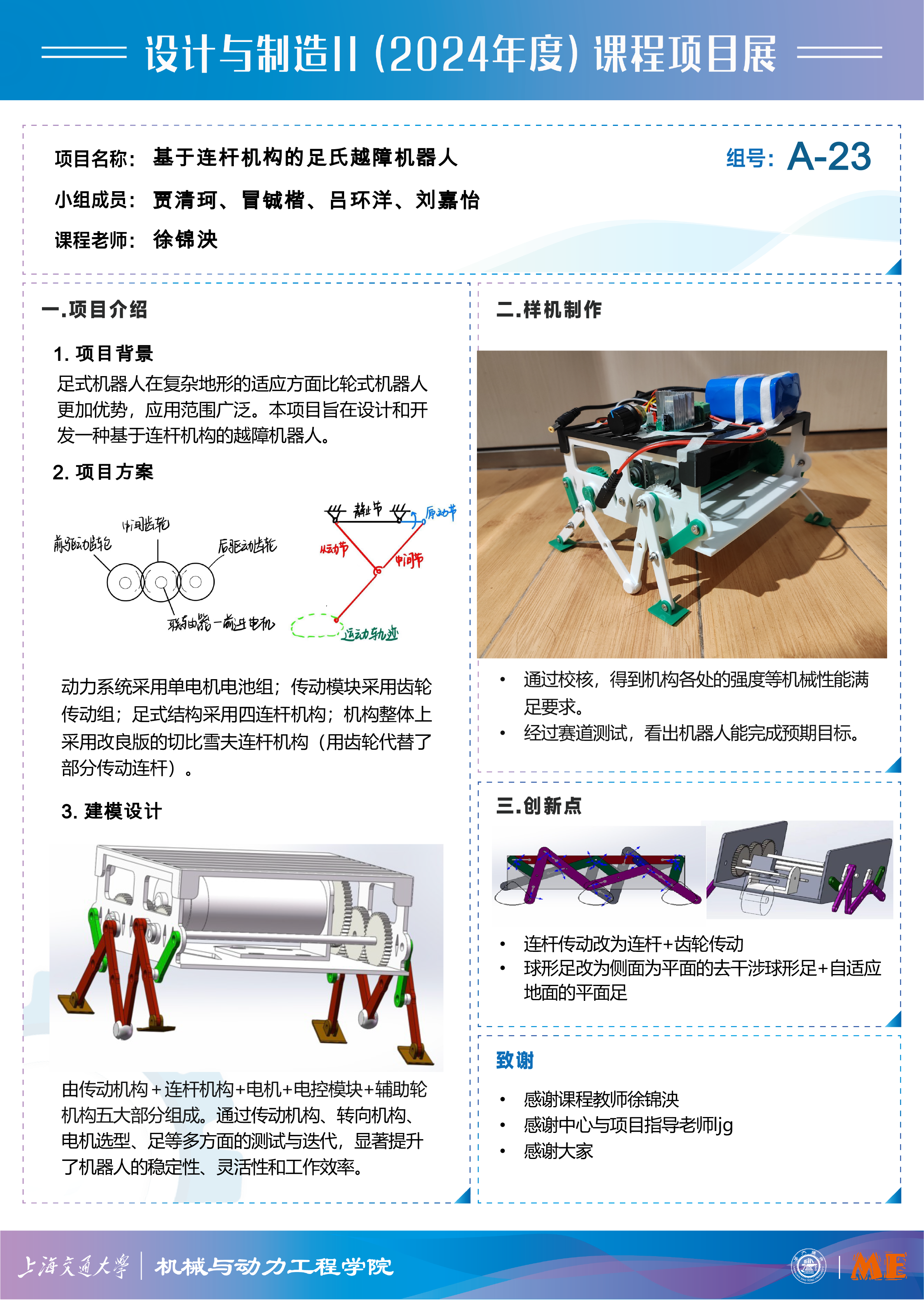 成功设计并制造出基于改良切比雪夫连杆机构的越障机器人,具备良好的跨越能力。通过传动机构、转向机构、电机选型、足等多方面的测试与迭代,显著提升了机器人的稳定性、灵活性和工作效率。通过挑战赛赛道的测试,机器人表现出不错的适应性,成功完成越障任务。