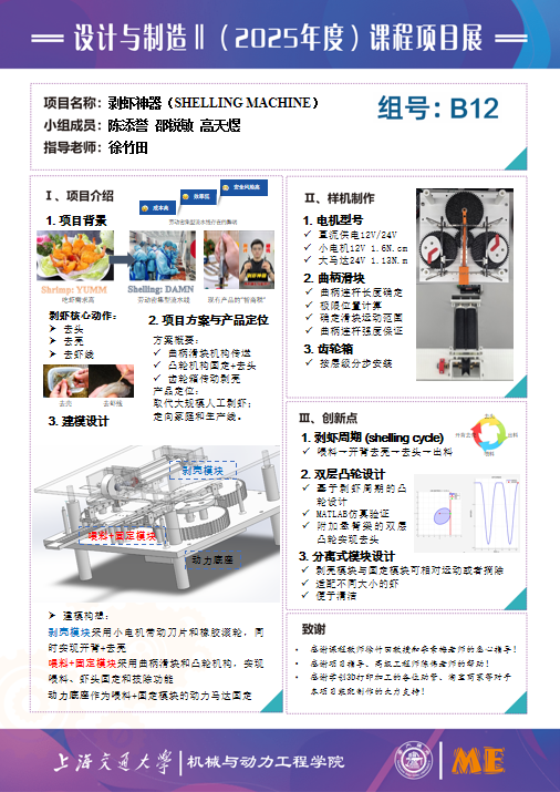 本项目由陈添誉、邵锐敏、高天煜团队在徐竹田教授、李素梅老师及陈伟高级工程师指导下研发,聚焦人工剥虾效率低、成本高、安全风险大及现有产品功能不全、灵活性不足等痛点,打造一款兼具家用与生产线适配性的剥虾神器。产品采用模块化设计,分为喂料 + 固定模块、剥壳模块及动力底座三部分,集成曲柄滑块机构、双层凸轮机构与齿轮箱传动系统,以 12V/24V 直流供电电机为动力源,通过 “喂料→开背去壳→去头→出料” 的完整剥虾周期,实现去头、去壳、去虾线一体化操作,具备便携轻便、自动化成本低、适配多场景的核心优势。