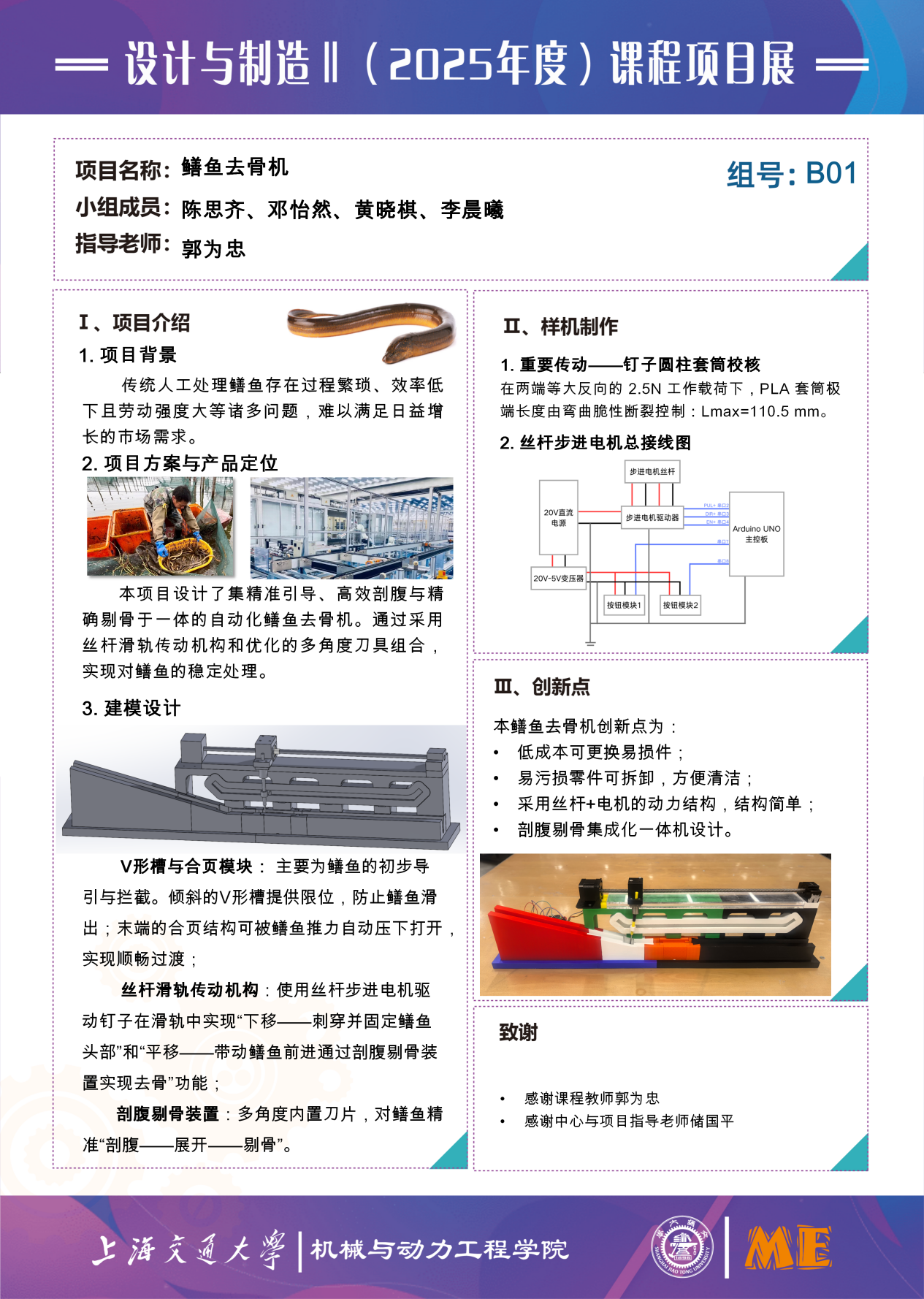 电控系统以Arduino UNO为主控板,搭配步进电机丝杆、驱动器及按钮模块,实现一键式正反转控制,完成全流程自动化。原型制作采用3D打印机架与核心部件,通过榫卯结构拼接解决精度问题,下钉轴部件采用铝合金材质保障强度。测试显示,原型机可稳定完成鳝鱼去骨作业,无干涉运行,成品规格统一,满足家庭用户需求。