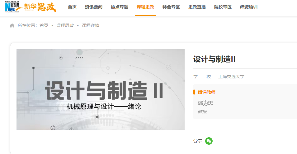 近日,教育部课程思政示范项目名单公布,beat365官网郭为忠教授负责的《设计与制造Ⅱ》获评课程思政示范课程。此次上海交大共有2门课程获评。