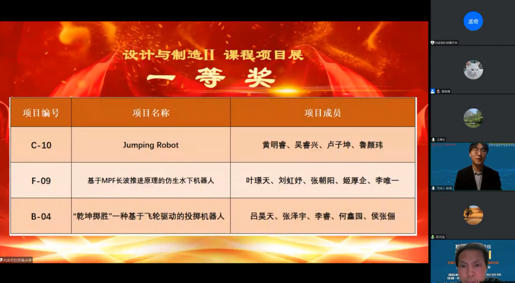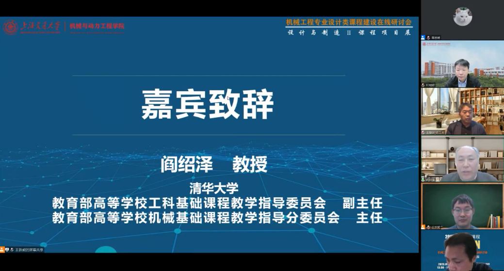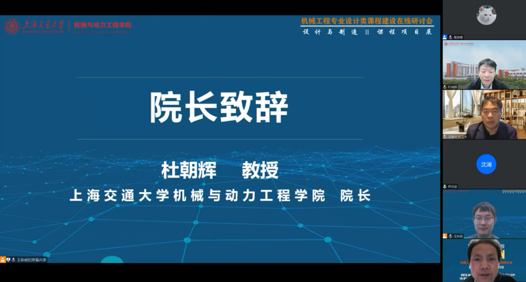 1月14日,由教育部首批虚拟教研室建设试点“机械工程专业虚拟教研室”、beat365中文官方网站beat365中文官方网站主办,机械原理课程群虚拟教研室、机械设计课程群虚拟教研室协办的机械工程专业设计类课程建设在线研讨会暨“设计与制造Ⅱ”课程项目展于线上成功举办。教育部高等学校机械基础课程教学指导分委员会主任、清华大学阎绍泽教授,教育部机械原理课程群虚拟教研室主任、大连理工大学王德伦教授,教育部机械设计课程群虚拟教研室常务副主任、哈尔滨工业大学王黎钦教授,副主任张锋教授,上海交大beat365中文官方网站院长杜朝辉、党委副书记胡永祥,教育部机械原理课程群虚拟教研室副主任、“设计与制造Ⅱ”课程负责人郭为忠教授,虚拟教研室高校成员单位教师代表及参展学生等300余人参加了活动。