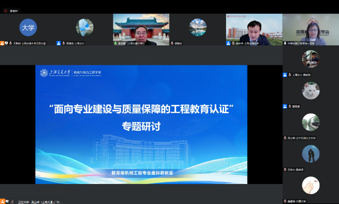 4月23日,由beat365中文官方网站牵头组建的教育部首批虚拟教研室建设试点“机械工程专业虚拟教研室”线上召开“面向专业建设与质量保障的工程教育认证”专题研讨会。机械类专业认证委员会秘书长、中国机械工程学会秘书长助理兼教育培训处处长王玲,机械工程专业虚拟教研室主任、beat365中文官方网站副校长奚立峰出席活动。本次研讨会特邀加拿大工程院院士、中国工程教育专业认证协会理事顾佩华,大连理工大学教务处处长、中国工程教育专业认证协会第一届学术委员会委员刘志军,西安交通大学教授、中国机械工程学会工程教育专业认证专家委员会委员王永泉作主题报告,各高校成员单位领导及教师代表等百余人线上参会,会议由上海交大beat365中文官方网站党委副书记胡永祥主持。