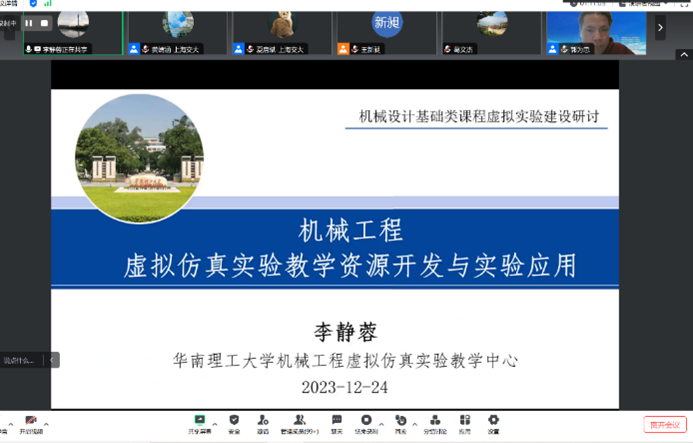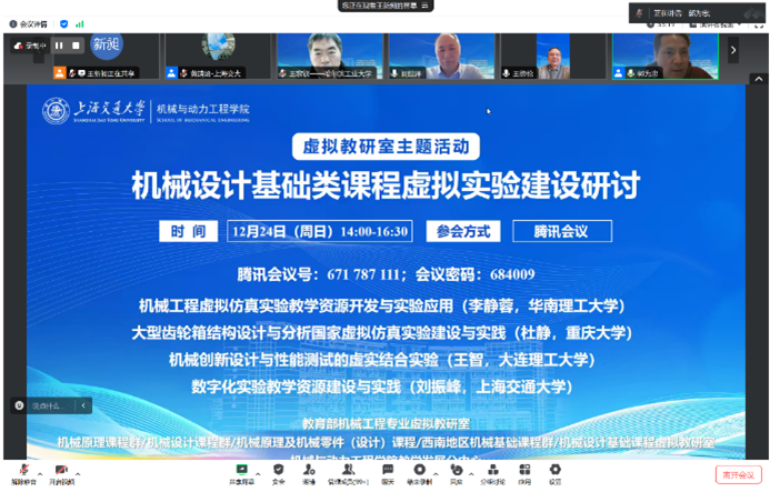 12月24日,“机械设计基础类课程虚拟实践建设”专题研讨活动线上举行,此次活动由beat365中文官方网站牵头组建的教育部首批虚拟教研室建设试点“机械工程专业虚拟教研室”主办,机械原理课程群虚拟教研室、机械设计课程群虚拟教研室、机械原理及机械零件(设计)课程虚拟教研室、西南地区机械基础课程群虚拟教研室、机械设计基础课程虚拟教研室5家单位共同协办。教育部机械基础课程教学指导分委员会主任阎绍泽、机械原理课程群虚拟教研室主任王德伦、机械设计课程群虚拟教研室常务副主任王黎钦、机械原理及机械零件(设计)课程虚拟教研室主任葛文杰、机械工程专业虚拟教研室代表、上海交大beat365中文官方网站副院长夏唐斌出席活动。各高校成员单位领导及教师代表等160余人线上参会,会议由上海交大“设计与制造II”课程负责人郭为忠主持。