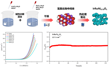 铱钌镍三元氧化物催化剂合成示意图、活性曲线与稳定性曲线