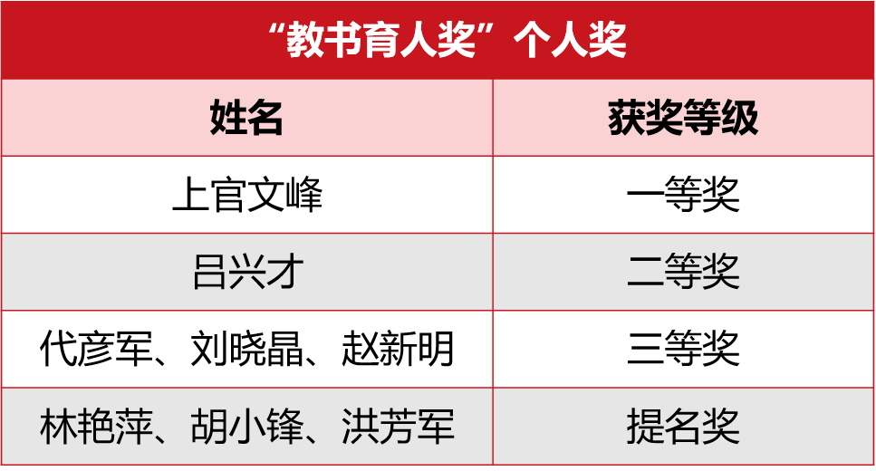 上官文峰教授的《能源材料》课程,获评上海市重点课程、精品课程;指导的学生中,5名学生成为大学教授;作为中日韩亚洲校园项目的发起人之一,为学科建设和评估以及研究生国际化培养模式做出了贡献,获学院“最受欢迎教师奖”和“最受欢迎导师”等荣誉;撰写出版中英文学术专著和教材2部,翻译出版科普读物3部,连续入选“中国高被引学者”,荣获上海市自然科学一等奖;担任党支部书记多年来,关心青年教师和学生的成长,积极投身教学和公益服务。