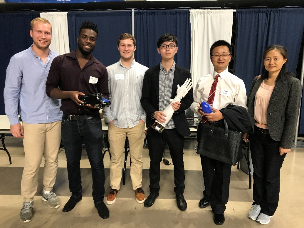 4月27日下午,本科生董凯良、龚畅阳、金鑫同学现场参与了宾州州立大学2017春季工程设计项目展,本次项目展共有来自中、美、瑞典、澳大利亚、比利时5个国家的129项项目参展,beat365官网共有11项本科生毕业设计国际合作项目参展。龚畅阳、Beck Tuvesson等同学的项目“Remote live-video security surveillance via mobile robot with Raspberry Pi IP Camera”展出了基于移动小车平台的实时远程场景视频监控系统、利用人-机交互方法的精细抓取操作装置,跨国紧密合作形成完善的系统功能、开发的精巧装置使得该项目成为展会会场最令人瞩目驻足的项目之一。祁照岗老师指导的“Impeller Axial Movement Study”项目凭借卓越理论研究成果及视觉呈现技术获得本次展会的最佳海报奖(Best Poster Award)。