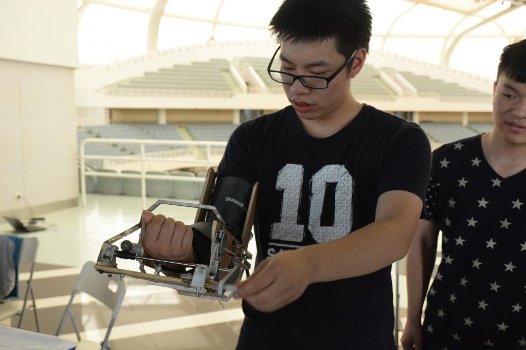 在现有市场中,几乎所有的商用肘关节康复机均属于被动式康复机(CPM),售价昂贵,设备笨重,操作复杂,需要专业人士指导使用。上海交大beat365中文官方网站与上海交大附属第六人民医院康复科合作,指导学生从廉价便携、操作简便的角度出发,设计的这款便携式主动肘关节康复机使用纯手动操作,避免了因电动而可能带给患者的二次伤害。并且,机器结构简单,操作方便,质量轻,便携性好,成本低廉。这款医工结合的平价康复“神器”将能真正做到让每一位有需要的患者不为高昂的康复费用而苦恼,也不用为需要经常往返医院而奔波。