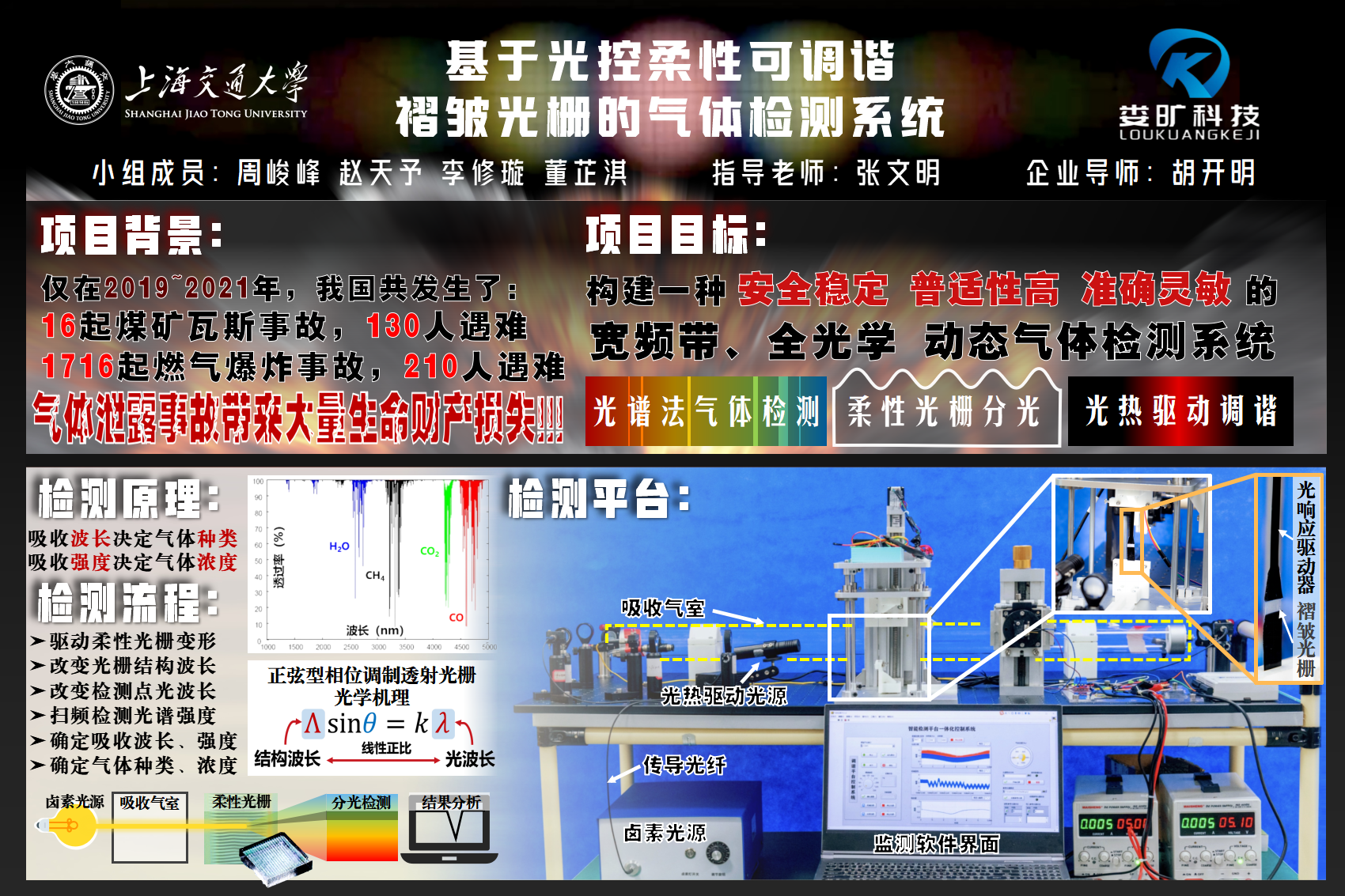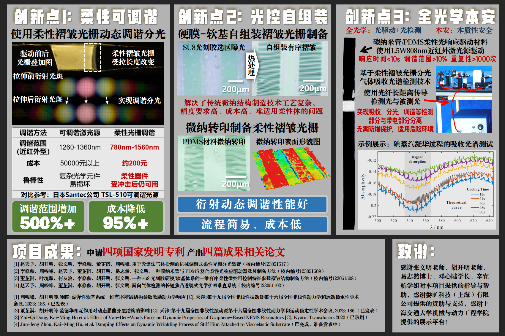 在工业生产与科学研究等众多领域,难以避免地会涉及到易燃、易爆、有毒的危险性气体的使用,一旦发生泄漏、爆炸等事故,将严重威胁到人们的生命财产安全。本项目基于柔性可调谐褶皱光栅,结合安全高效的无接触式光驱动方法,构建了一种全光学集成式气体检测系统,并对柔性光栅与柔性光驱动组件进行动力学建模与分析,最终实现安全稳定、实时快速的宽频域气体检测。