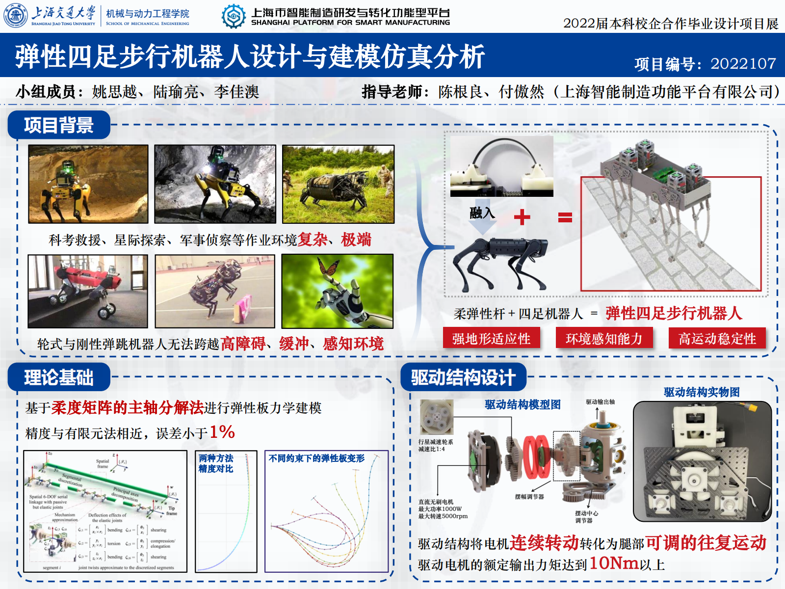 (1)本项目初步完成了弹性四足步行机器人的结构设计与实体设计,实现了将电机匀速转动变换为往复摆动的驱动机构。