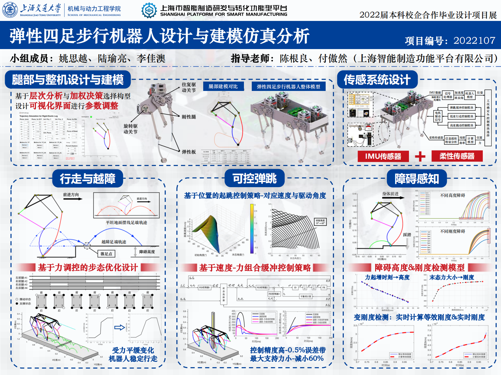 (2)本项目建立了腿部的力学模型,同时使用冗余数量的传感器实现了对外部载荷的感知反馈。利用传感信息,完成了对障碍高度与刚度的检测方案与仿真。