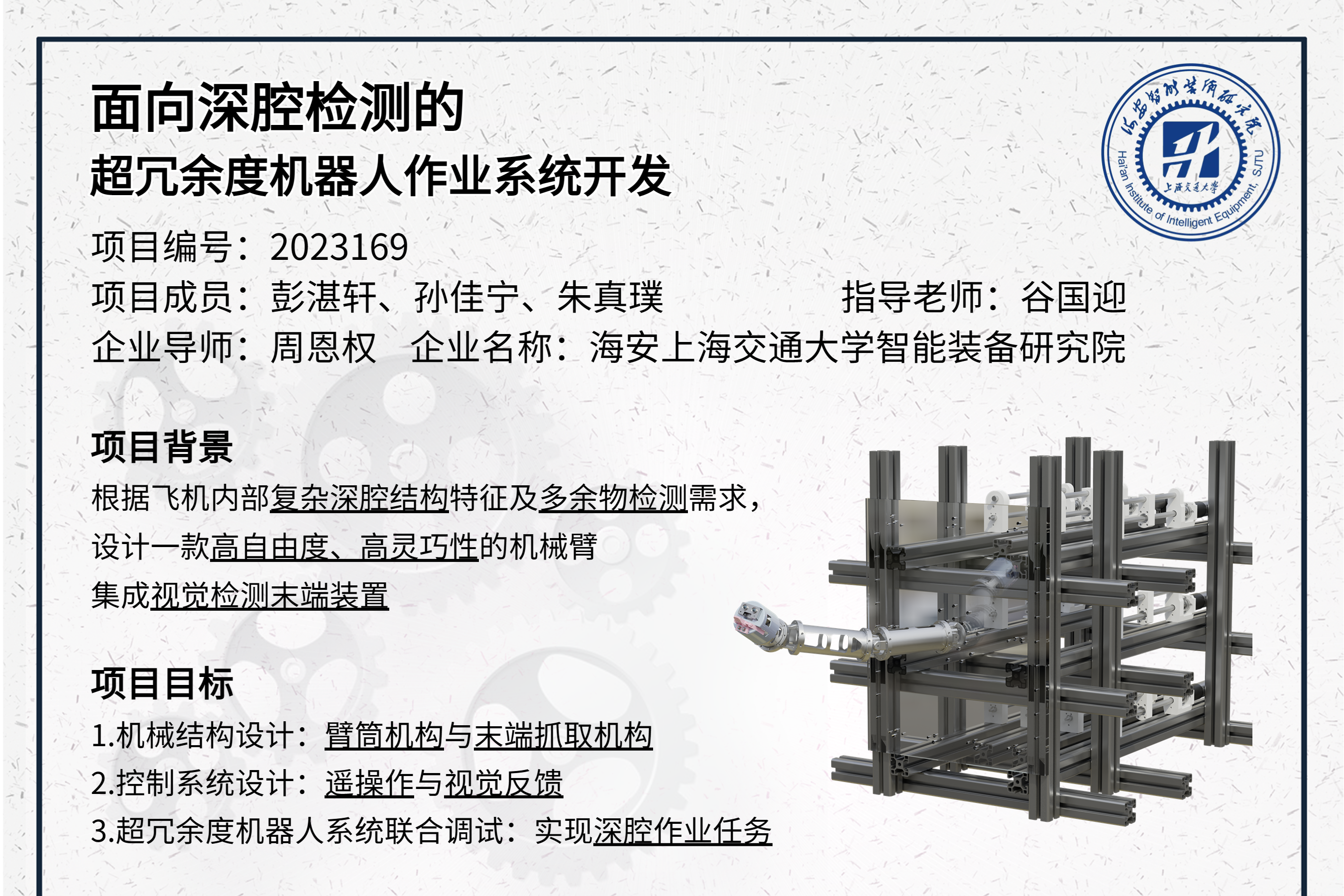 在飞机制造和装配复杂深腔构件时,易产生切屑、螺钉等多余物,对运行安全构成威胁。每年因多余物导致的飞机故障约占故障总数的1.5%左右,成为低层次质量事故的重要原因。但由于深腔结构复杂、狭窄、弱/无光、封闭、多障碍的特点,传统工业机器人无法进入,难以对多余物进行检测。因此,需要一种高自由度、高灵巧性的机器人系统,能够检测和拾取在深腔结构中的物品。本项目旨在开发这样的超冗余度机器人系统,以实现深腔环境的检测和多余物拾取。