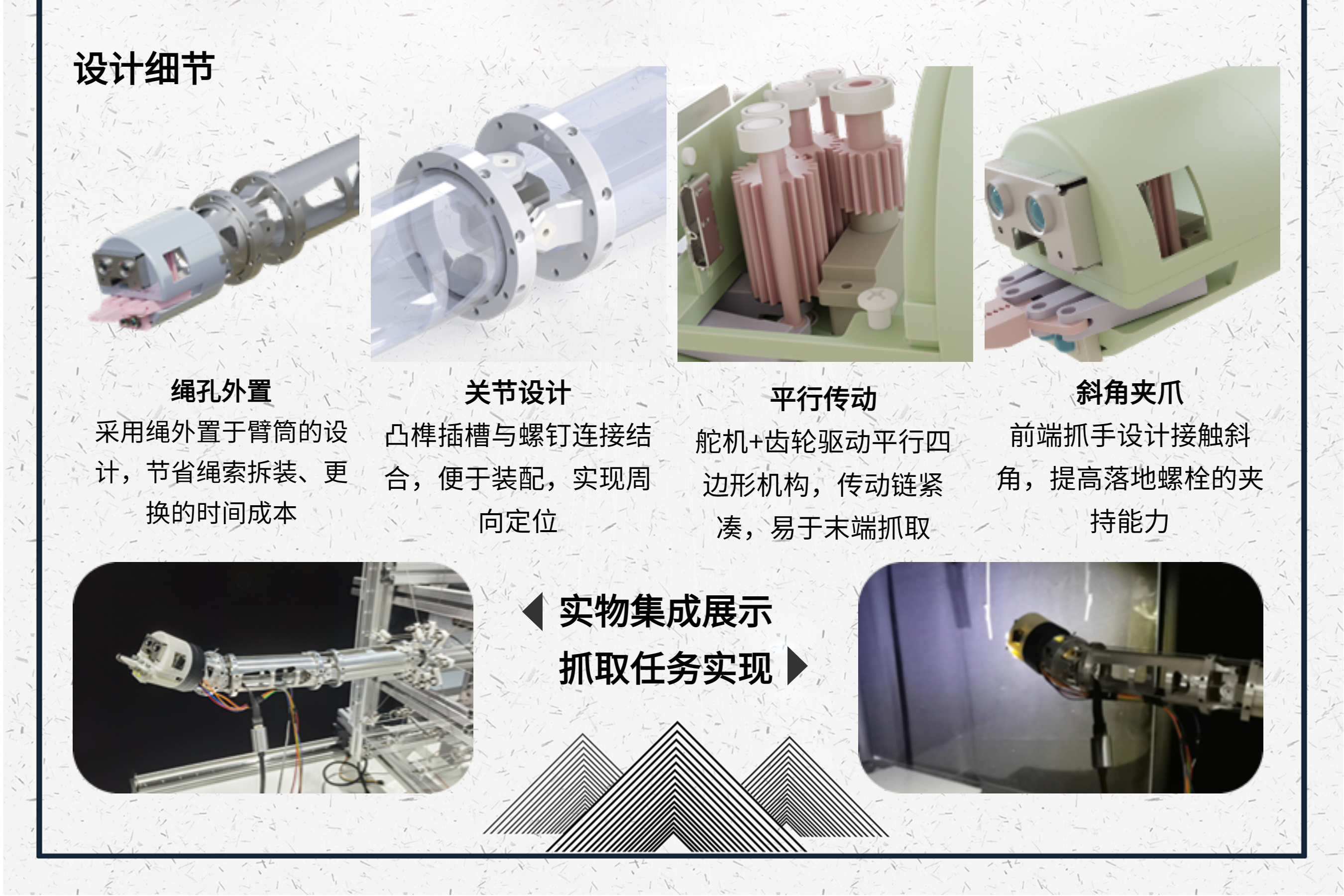 本项目实现了以下成果:蛇形机械臂臂筒机构优化能够解决驱动绳快速拆装问题,并实现轻量化设计,使得臂体具有更高的机构强度、更好的可加工性和可维修性。蛇形机械臂末端装置能够进行更为集成化、小型化、轻质化的设计,提高蛇形机械臂的灵巧性、承载能力,同时实现如遗落物抓取、双目测距等多项工作。模块化架构解决了安装便捷性和经济性方面的不足,对力学信息、视觉信息进行了集成化分析处理,提升多余物夹取的效率与成功率。