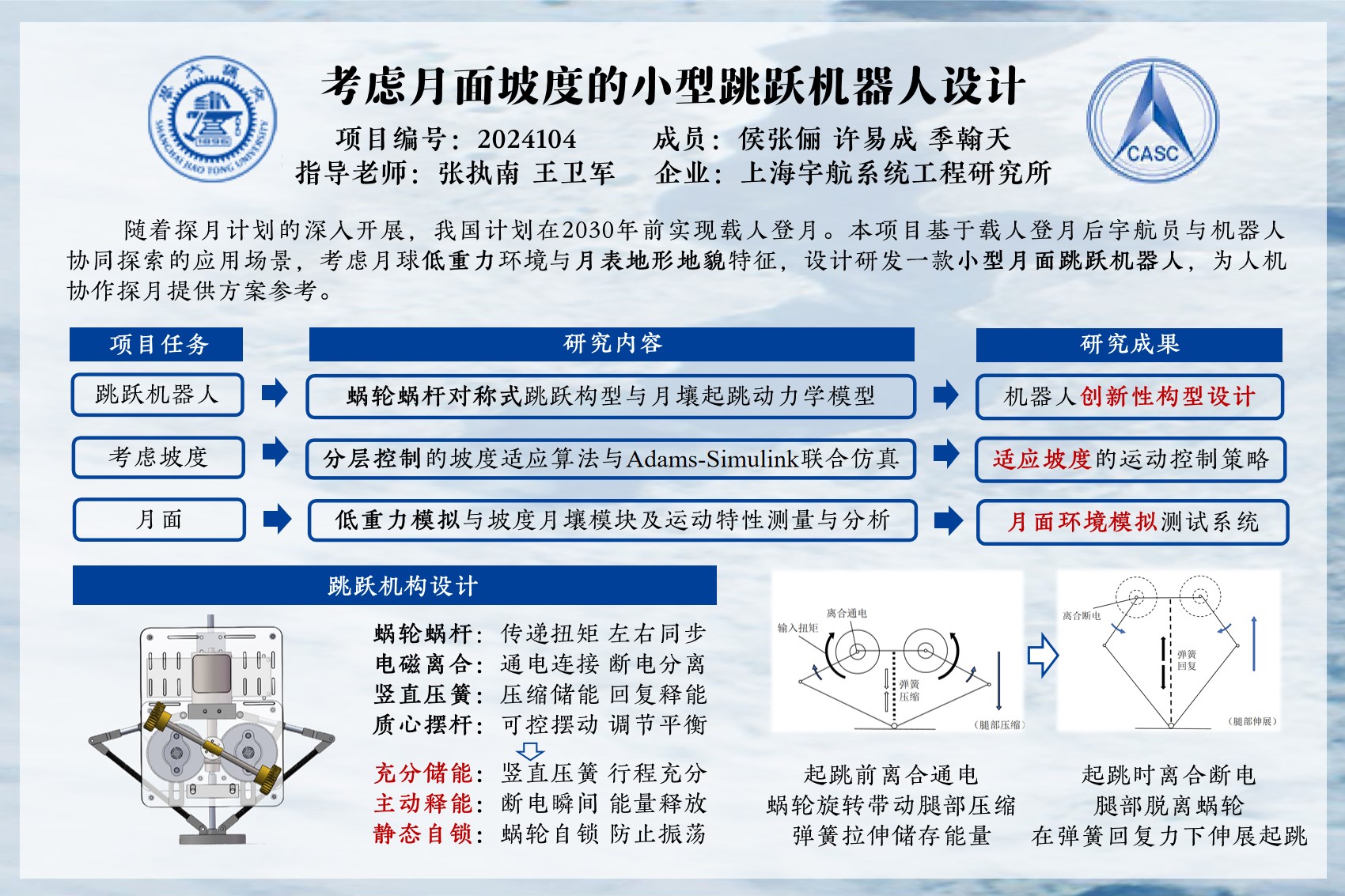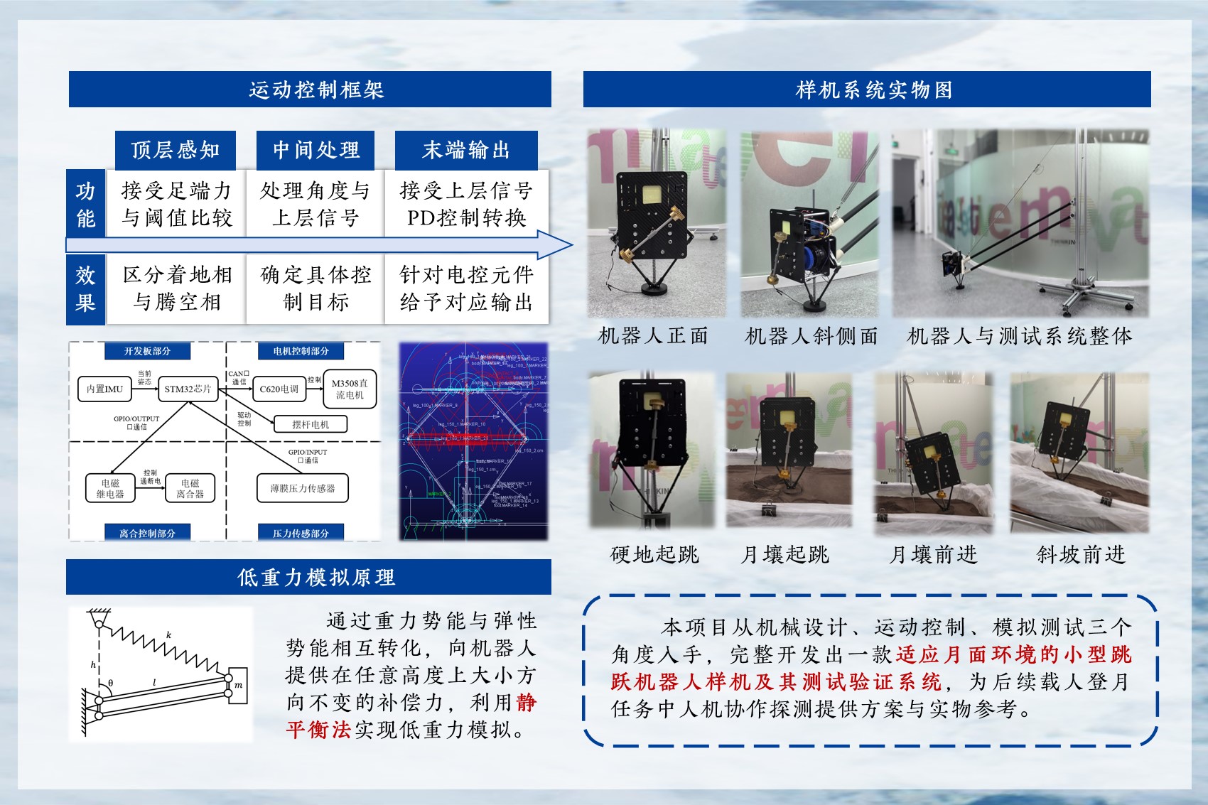 考虑载人登月人机协作的任务背景,创新性研发一款适应于月球重力和月面地形地貌的小型跳跃机器人,并满足相关设计指标:控制机器人整机质量与空间尺寸在指定范围内;机器人在运动过程中能够适应低重力环境,并在月面重力环境下达到企业的跳跃高度指标;适应一定范围内的坡度变化,完成上下坡运动;满足月面承载力要求,可进行松软土壤上的可靠运动。经前期设计和仿真测试验证方案可行性,并最终开展实物试验与仿真结果互相印证。