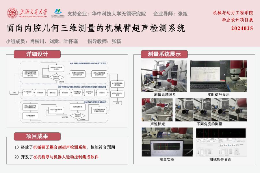 本项目提出了面向内腔几何三维测量的机械臂超声检测方法并研制了一套测量装备。其中设计了一种无耦合剂超声测厚探头并集成于机械臂,对机械臂超声检测系统进行了运动学参数标定和运动误差补偿,并提出了基于该测量系统的内腔无干涉测量路径规划方法。项目完成了集成机械臂运动控制与高精度超声测厚功能的软硬件系统搭建,并以长轴空心管内圆周为对象进行了试验验证,实现了对5~20mm厚度空心管内圆周的三维测量精度达±0.2mm。