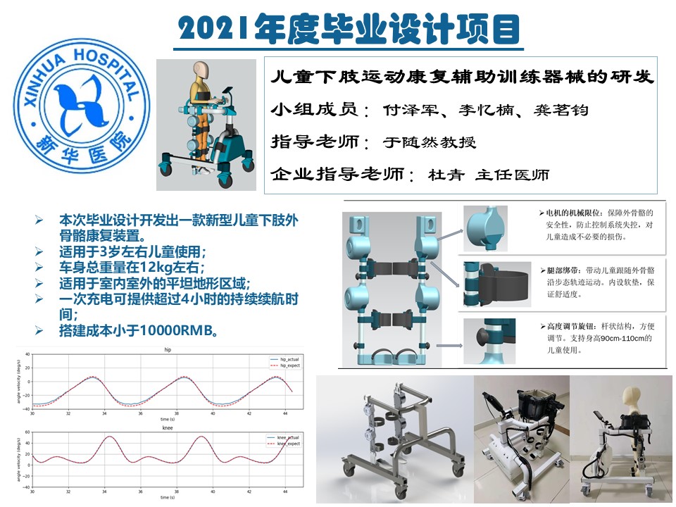 1、完成了设计的任务目标,开发出一款新型儿童下肢外骨骼康复装置并配套开发出控制系统、人机交互界面和步态规划仿真软件,提供了体重支撑、阻力训练、直线行走等辅助功能。