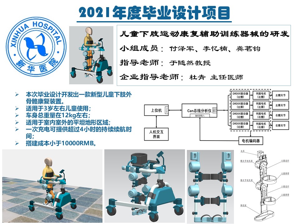 本次毕业设计针对我国脑瘫儿童早期干预工作的必要性和迫切性,提出一种面向脑瘫儿童下肢运动能力康复的新型外骨骼辅助方式。从人体工学的角度出发,设计了一种移动辅助小车式儿童外骨骼康复训练器械,开发了相应的控制系统及步态规划仿真软件,最后完成实物搭建与测试证实该方案的可行性及安全性。