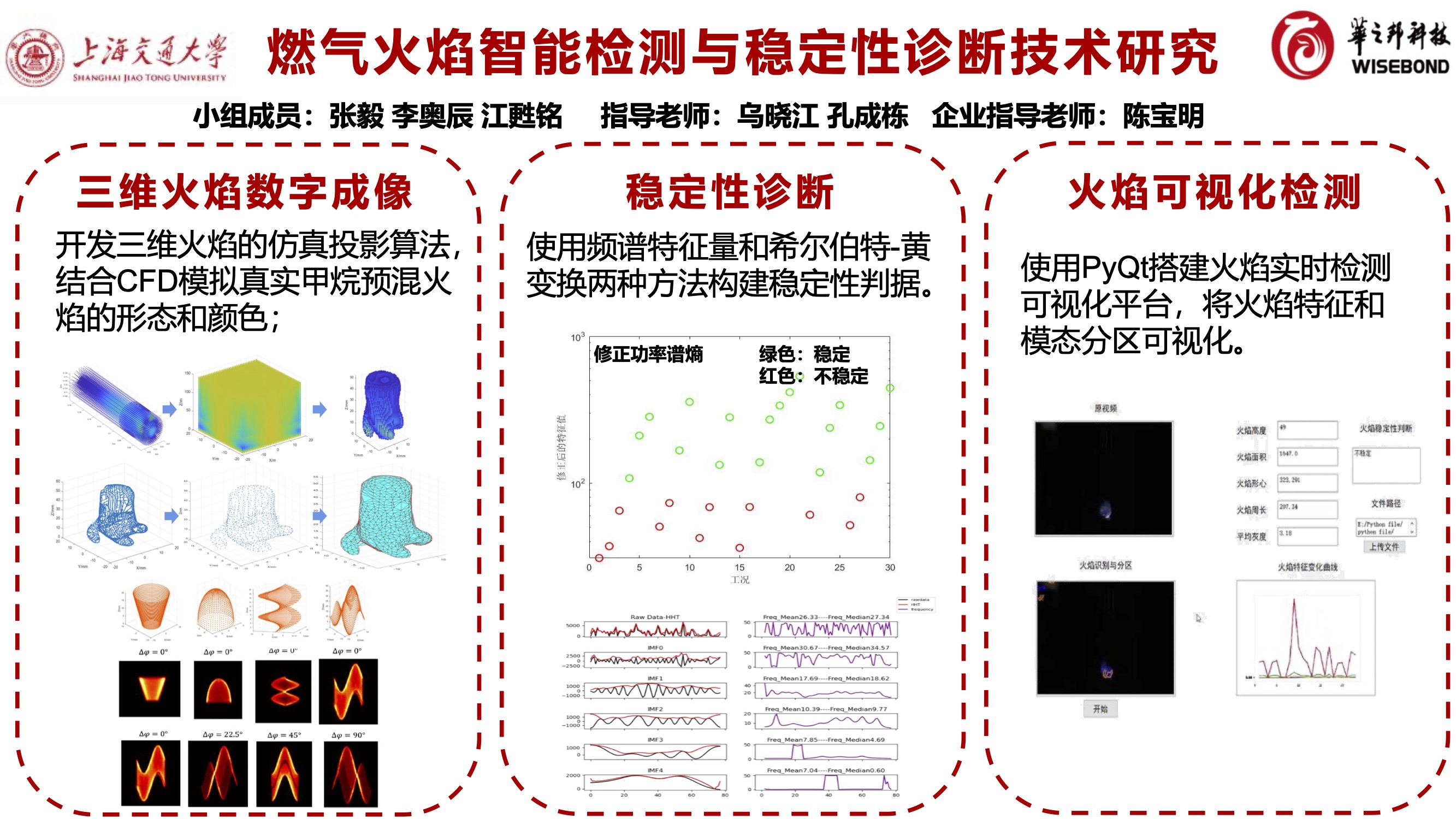 燃气锅炉工作时,燃烧不稳定可对燃气锅炉造成重大损害。一种解决思路是对燃气锅炉进行燃烧诊断,配合控制系统减少燃烧不稳定现象的发生。燃烧诊断目前多以离线诊断为主,目前常见的燃烧在线诊断技术准确性较低。本项目根据实验获取不同模态火焰的燃烧影响,通过火焰三维数字投影成像方法获得大量火焰虚拟投影影像数据,并利用模态分类等工具建立了火焰燃烧稳定判据,建立了前端平台并以实际火焰燃烧影响进行测试。