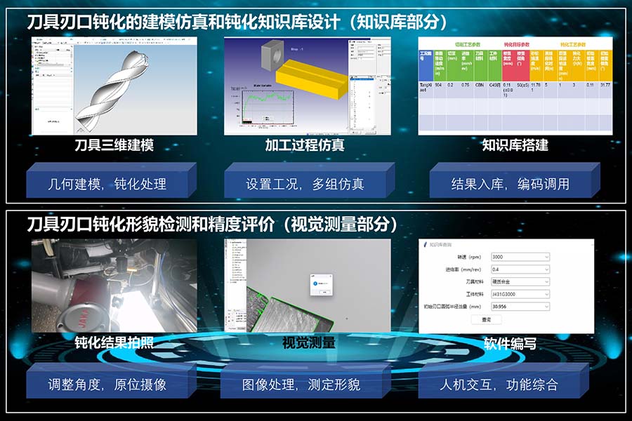 本项目完成了机器人刀具刃口钝化机电系统设计、刀具刃口钝化的建模仿真和钝化知识库设计、机器人钝化参数图像检测的原理和系统设计,基本完成了既定项目目标。确定了在与企业给定工况相近的情况下,CBN镗刀与硬质合金麻花钻的最佳钝化形貌、将刀具修磨至最佳钝化参数的钝化工艺,完成了修磨结果的测量。根据实验结论,将钝化各类参数收录到钝化知识库中,编写了机器人修磨系统软件以进行数据的调用或补充。