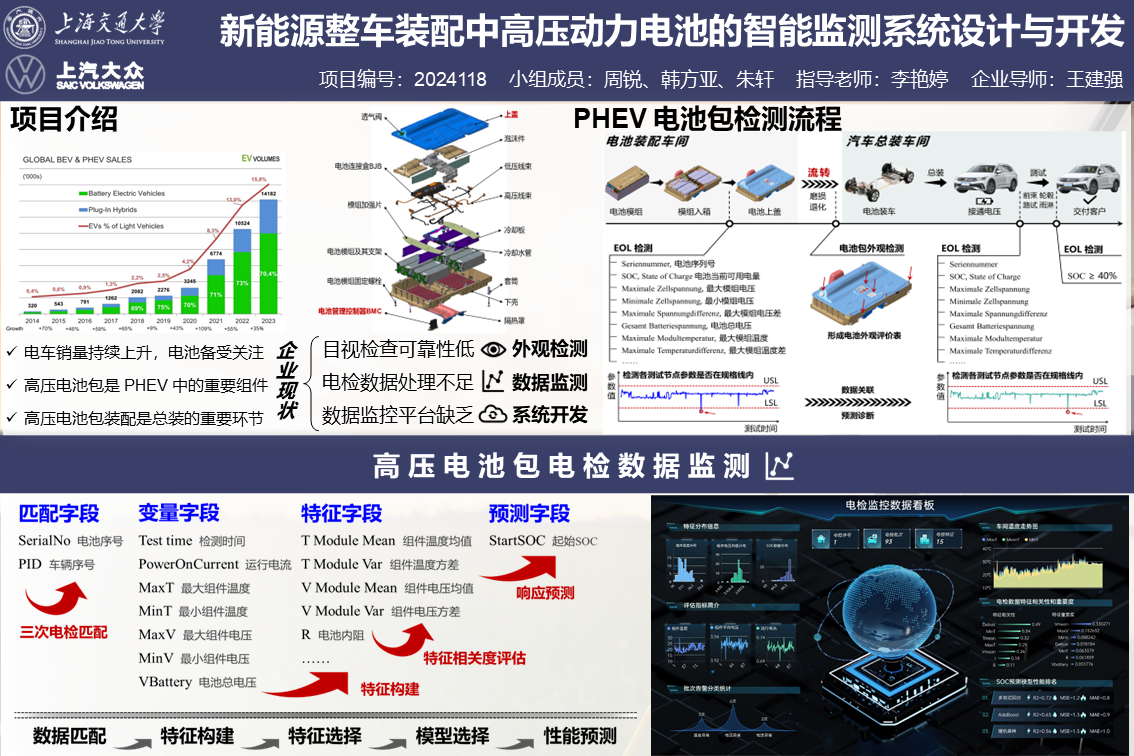 本项目针对当前上汽大众在推动电动汽车产线建设中PHEV高压电池包装配过程中存在的缺陷检测不准确、电检数据利用率低和作业安全风险问题,提出了一套综合机器视觉和数据分析方法的PHEV高压电池包装配全流程自动化监测系统。通过分析电池包生产与装配流程,开发了基于机器视觉和神经网络的外观缺陷检测算法,利用数据分析技术构建了关键性能指标的预测系统,并设计了集成以上功能的自动化监测软件。该系统显著提高了缺陷检测的准确性与作业的安全性,同时通过有效的数据监控与分析,提升了质量控制的效率和响应速度,为上汽大众提供了一套操作简便、数据可追溯的质量监控解决方案,有力支持了企业的自动化转型战略。