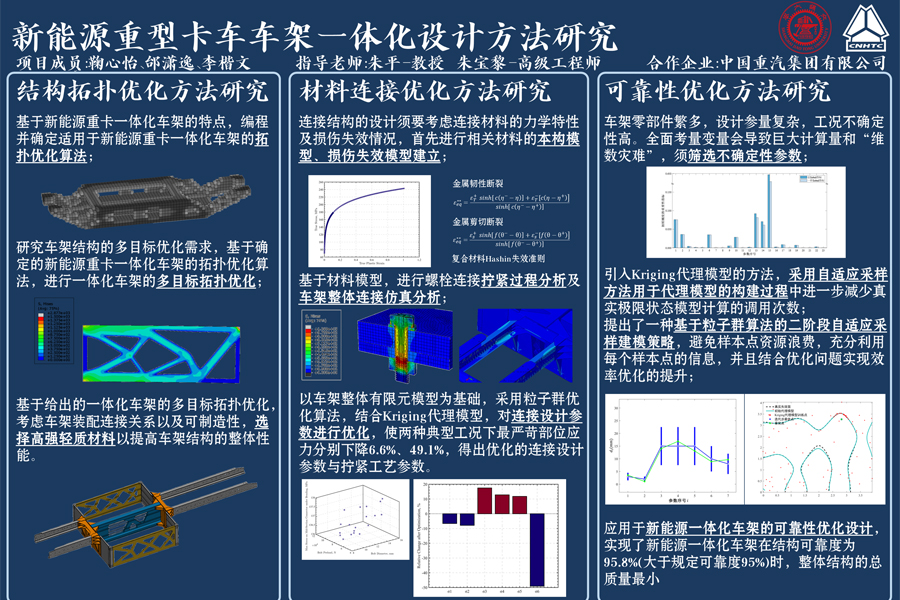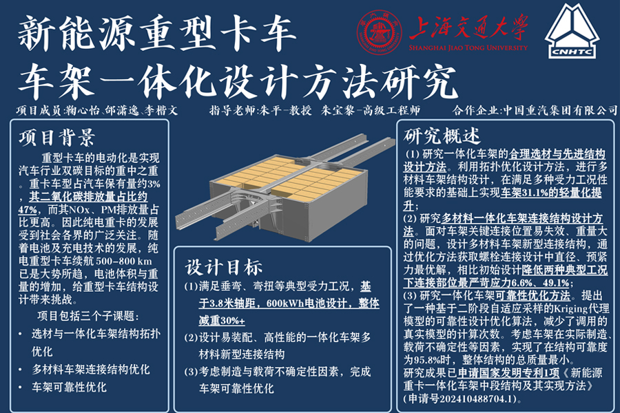 项目目标如下:设计出相对于传统3.8米轴距车架以及布置600kWh电池框架(总重1200kg)的减重30%以上的新能源重型卡车一体化车架;设计出满足垂弯、扭弯等重型卡车典型受力工况性能要求的一体化车架,达到行业领先的轻量化水平;设计出易装配、高性能的一体化车架多材料新型连接结构;考虑实际制造、载荷不确定性等因素的一体化车架可靠性优化设计。