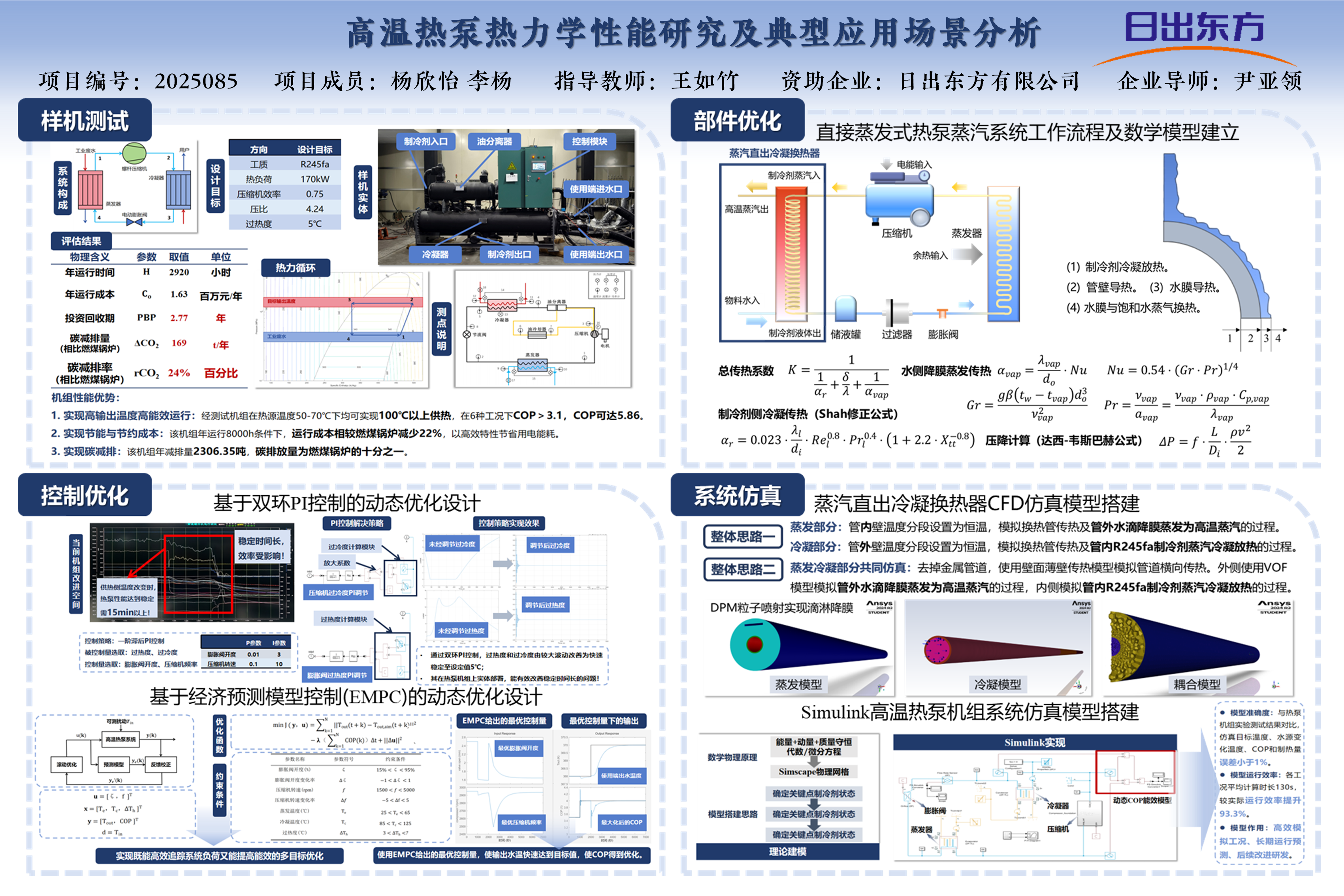项目对高温热泵机组进行测试分析得出数据,机组 COP可达5.86,㶲效率可达54.25%,能效表现佳;机组相比燃煤锅炉,年运行成本减少22%,产生24%的碳减排效益,实现节能减排目标。项目设计了蒸汽直出冷凝换热器,对其进行数学建模及CFD仿真分析,利用工业生产中的余热,使用高温热泵机组实现直接蒸汽供应,提高蒸汽生产能效、减少成本。项目开发了基于PI双环控制和经济模型预测控制(EMPC)的动态控制优化策略。经仿真验证,后者通过目标追踪和能效提升的双目标控制将COP从未受控制时的3.68提升至4。两种控制策略在热泵机组上实体部署,能有效改善稳定时间长的问题,提高长期运行效率。
