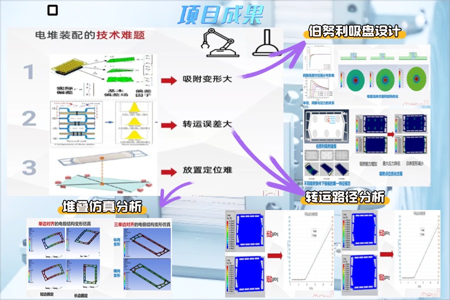 (1)研究双极板和膜电极真空吸附过程中的变形误差,分析真空吸附时自由部分产生的翘曲和振荡。优化吸附条件,设计真空吸附载荷以及完成伯努利吸盘吸附情况仿真设计。
