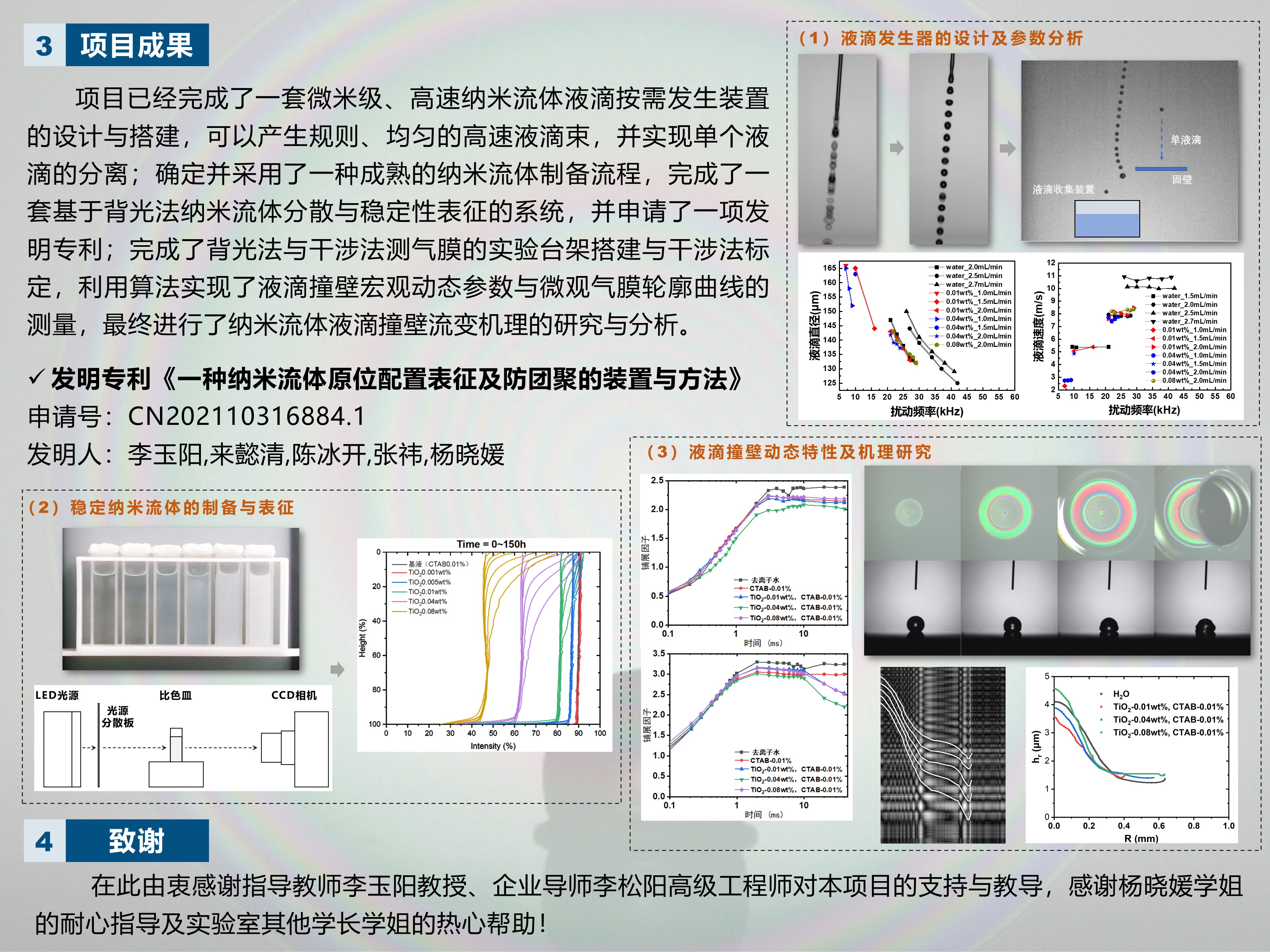 项目目标为设计一套可行的实验装置、实验及分析方法,能够进行稳定性高、分散性好的纳米流体的制备与表征,并设计一个稳定的液滴尺寸、速度等参数宽范围可调的单液滴发生器,对常规纯流体和制备所得的纳米流体等不同液体进行实验测试,同时配合背光拍摄法和干涉成像法进行纳米流体液滴撞壁的动态测量研究,获得纳米流体液滴撞壁过程的特征参数并与常规纯流体液滴撞壁实验进行对比,以此分析纳米流体液滴撞壁过程中的机理。