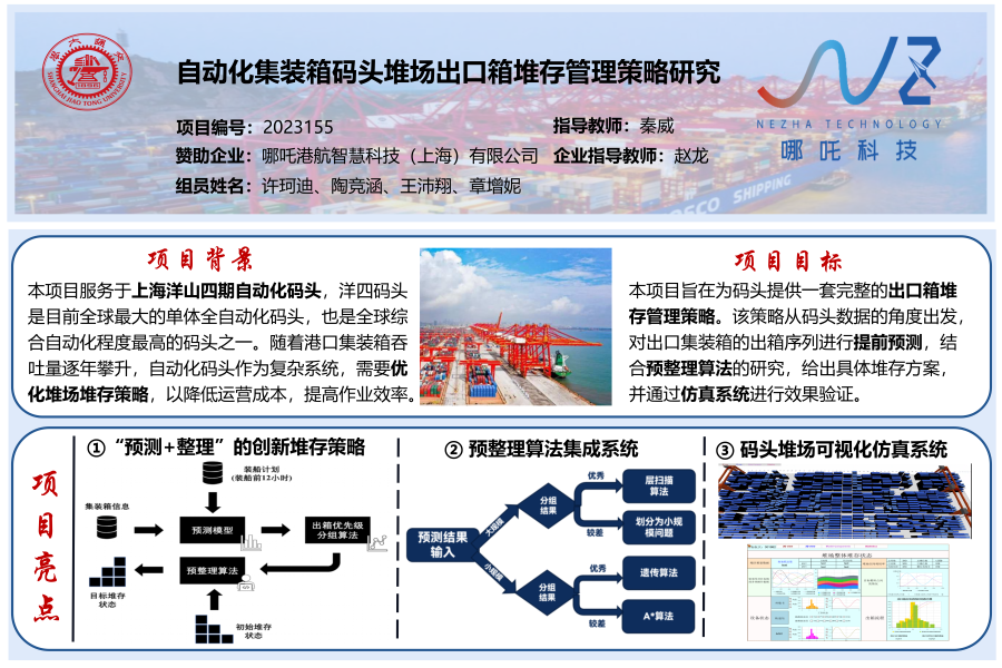 码头是世界贸易的重要枢纽,本项目服务于世界最大的单体自动化集装箱码头之一:洋山四期自动化集装箱码头。针对其出口集装箱翻箱率高,装船效率低的问题,创新性地提出了“预测——整理“的出口集装箱管理策略,利用自动化集装箱码头的大规模数据来预测集装箱的出箱顺序,并根据此顺序在箱区内中转时对其进行整理,使其达到有序状态,以避免未来的翻箱,该策略的实施能够有效的降低堆场运营成本,提高码头的服务效率,为自动化集装箱码头的智能化贡献力量。