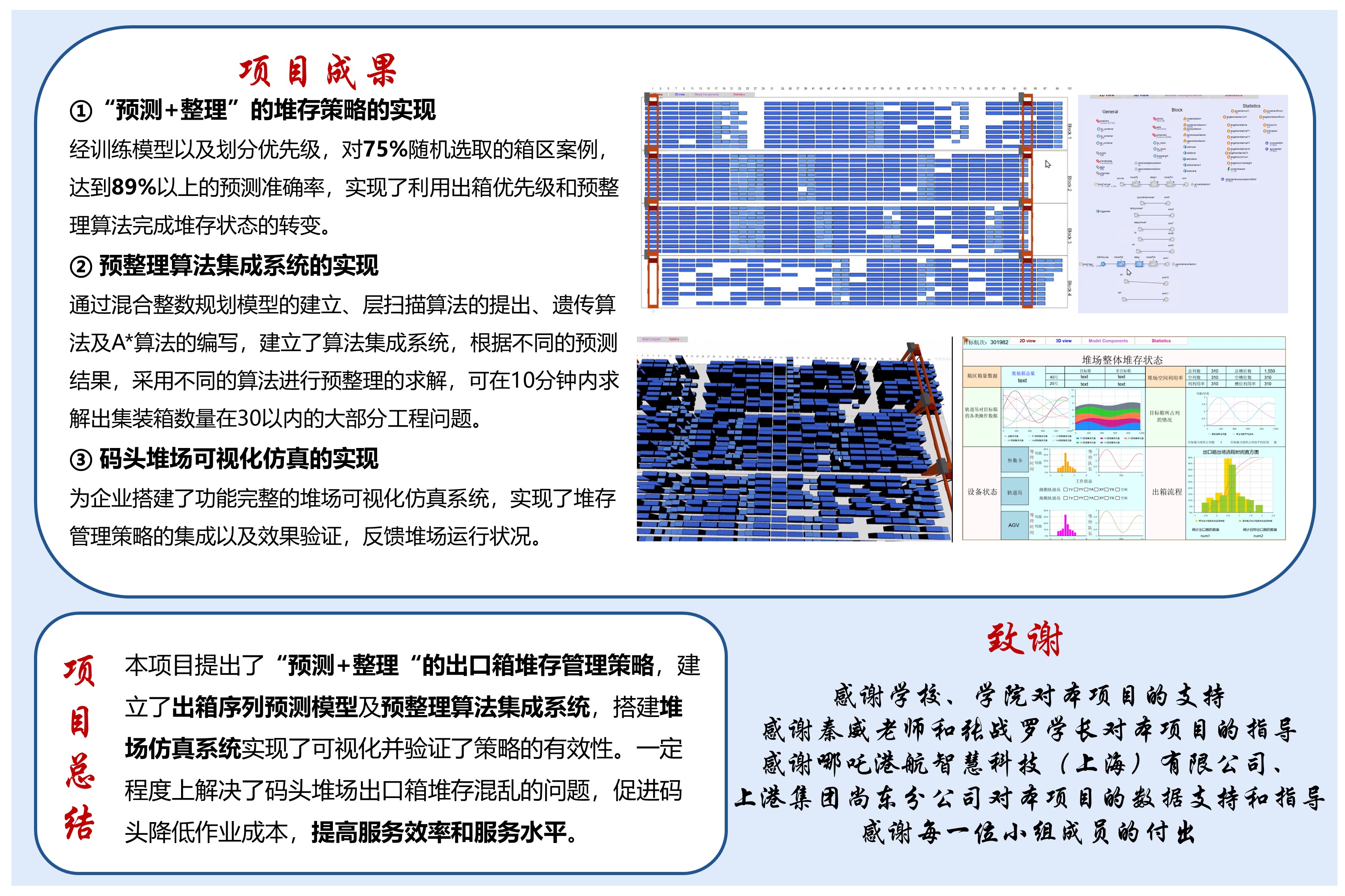 本项目通过对洋山四期自动化集装箱码头数百万条数据的分析,验证了堆场是码头的瓶颈环节,并且验证了堆场翻箱和服务效率的相关性,从数据的角度,有力的论证了堆场是目前码头管理的重中之重。从数据中提取特征,对集装箱出箱顺序进行有效的预测,有着了极高的准确率,根据此结果编写了不同的算法,解决工程中不同规模、不同复杂度的集装箱异地整理问题,可以在10分钟内解决出大部分集装箱数量在30个以内的整理问题。最后通过建立仿真模型,对本项目提出的方案进行验证,得到了码头方工程师的高度认可,并且依据此项目内容,撰写了两篇学术论文,项目研究兼具工程应用性和学术研究性。