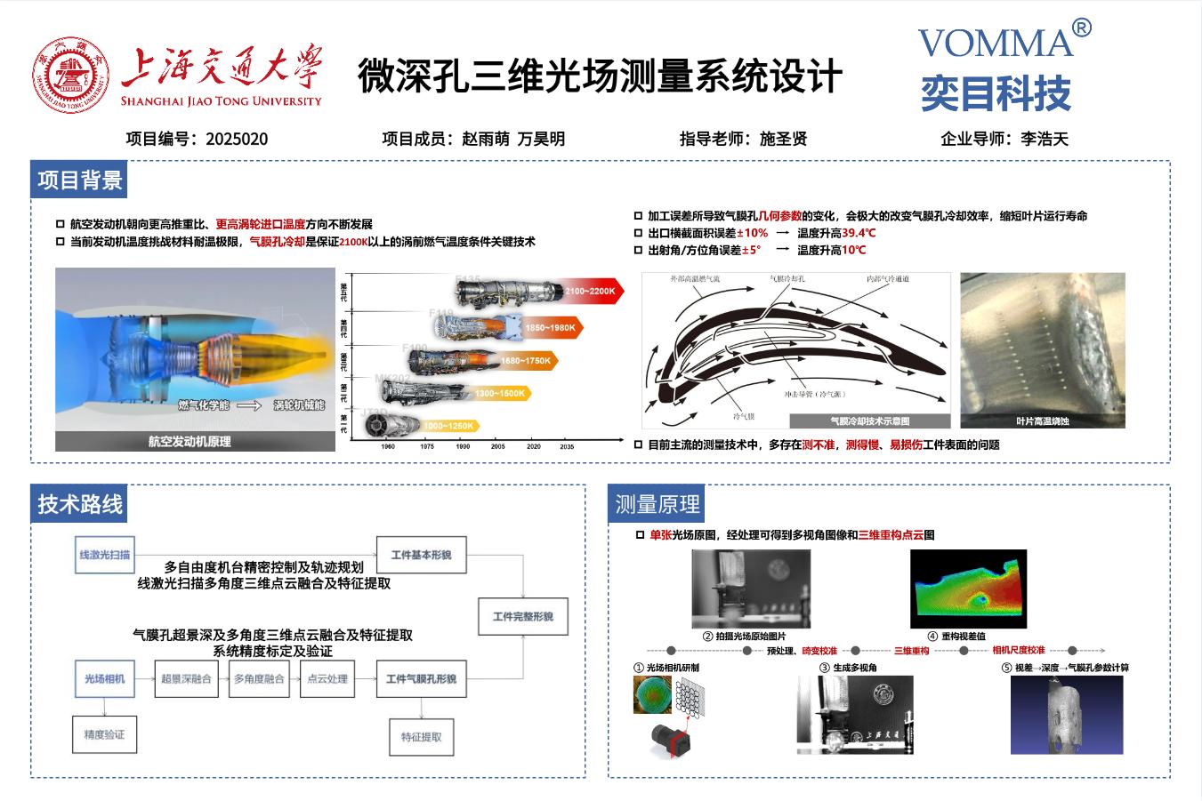 航空发动机朝更高推重比、更高涡轮进口温度方向发展,气膜孔冷却是保证2100K以上涡前燃气温度的关键技术。而气膜孔的加工误差所导致的相关几何参数变化,会极大改变气膜孔冷却效率,缩短高温部件寿命,威胁发动机运行安全。经与合作企业现场交流,气膜孔当前采用芯棒测量为主,存在测不准、测的慢的问题光场相机通过微米透镜阵列、仿生昆虫复眼,单相机实现三维成像。本项目利用此技术开发微深孔三维光场测量系统,在保证精度的同时,大幅提升效率。